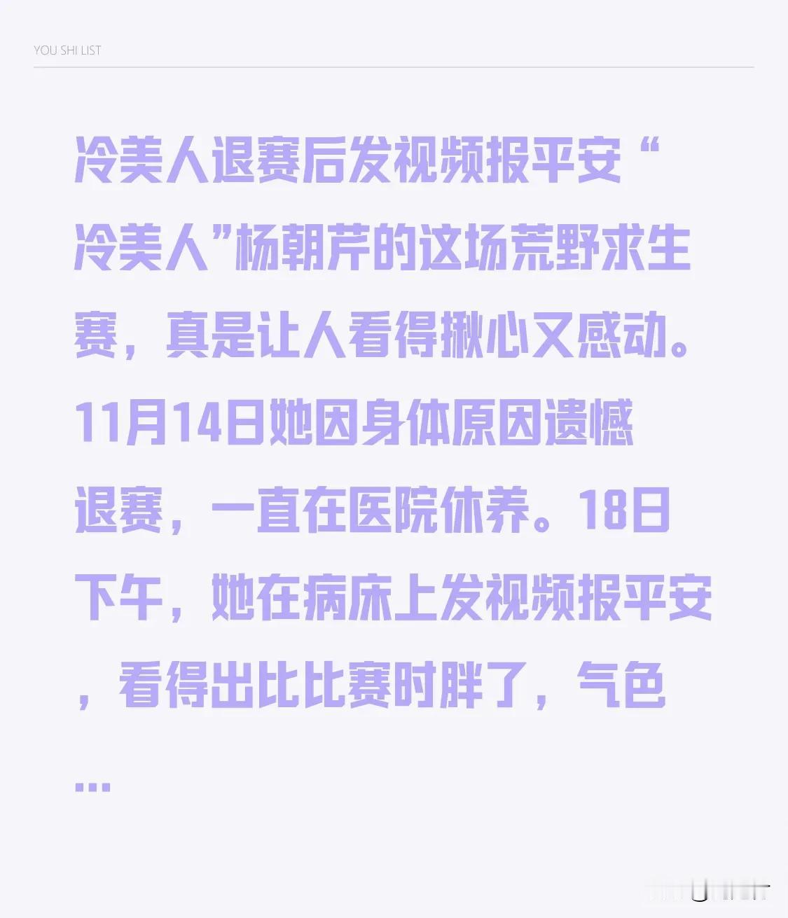 冷美人退赛后发视频报平安 “冷美人”杨朝芹的这场荒野求生赛,真是让人看得揪心又感动。11月14日她因身体原因遗憾退赛,一直在医院休养。18日下午,她在病床上发视频报平安,看得出比比赛时胖了,气色也好了。 此前她参赛37天,钻木取火底板第一天就坏了,还花五小时自制工具生火。第36天生理期痛到打滚,第37天晕倒被紧急送医。虽退赛了,但她拿到38667元奖金,治疗费也由景区承担,还成了旅游推荐官和形象大使。她感谢网友的支持与担心,不过头发像“石头”梳不开的后遗症,看着还是让人心疼。 荒野求生女选手 荒野冷美人 荒野求生女战神 荒野求生女性 求生姑娘