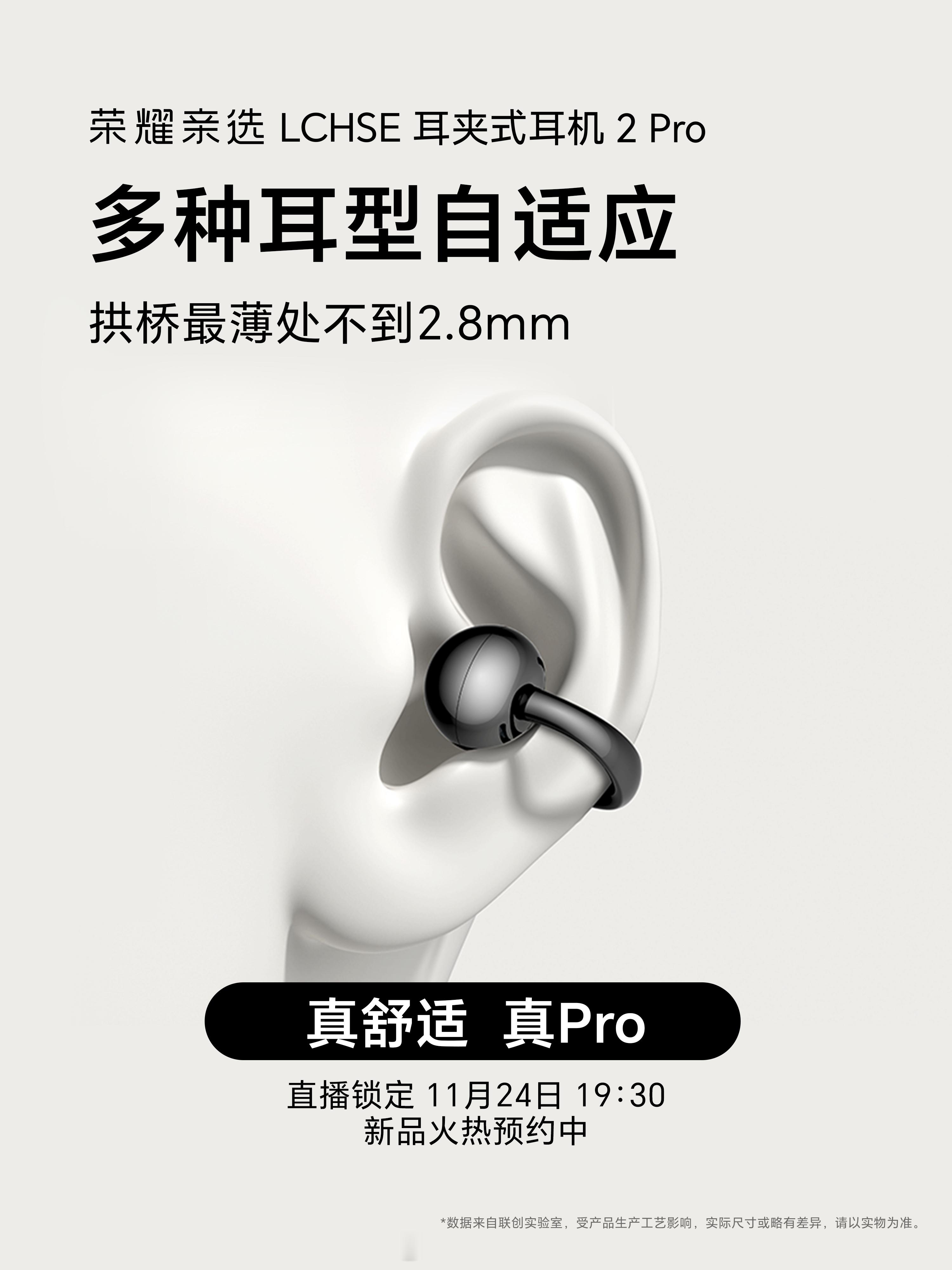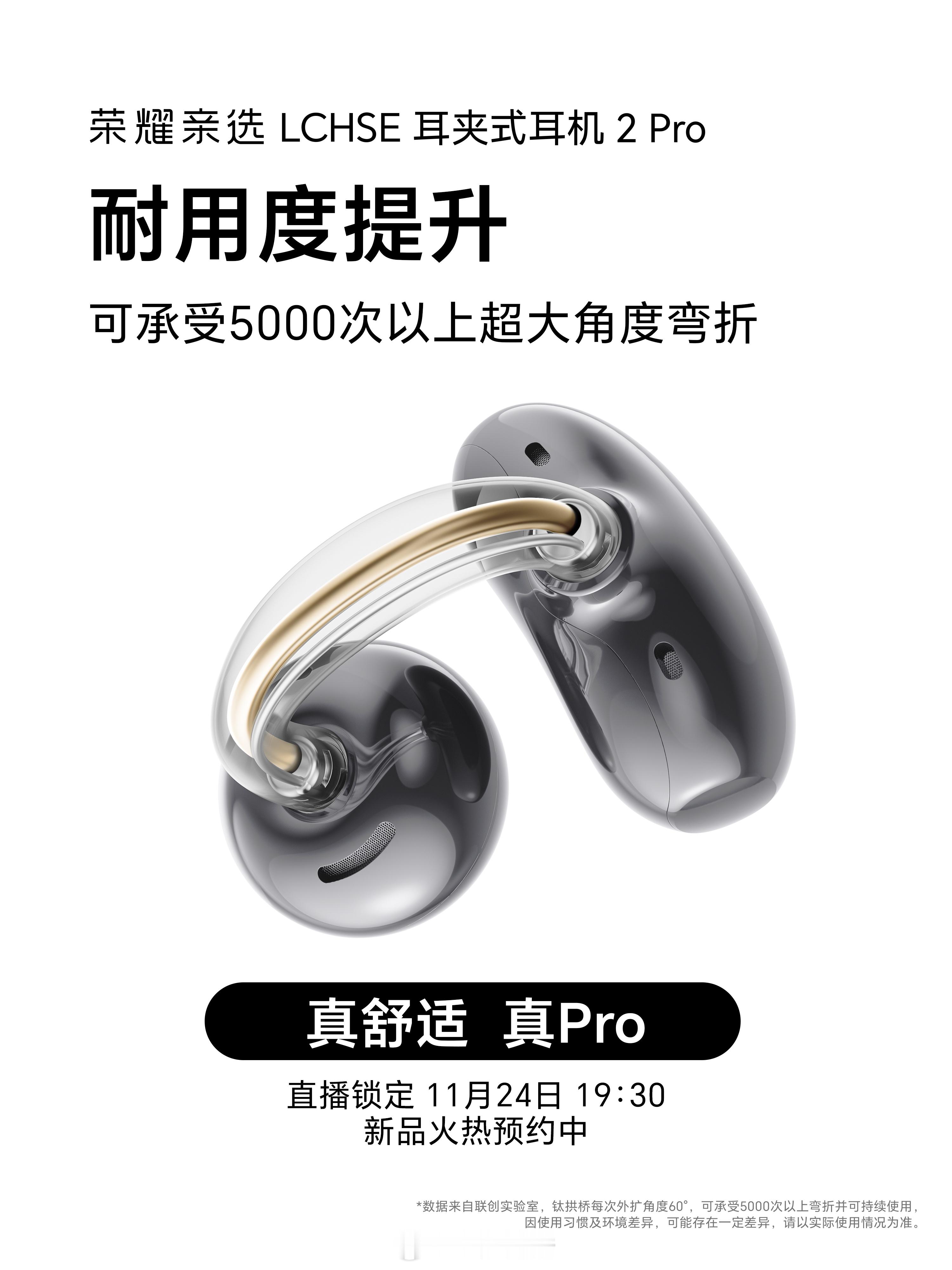荣耀耳夹耳机2 Pro全新升级的舒适钛拱桥2.0内部材质升级成更软弹的钛合金记忆金属丝,对耳朵的物理压力更小,佩戴更舒适。钛合金核心经过5000次以上的大角度弯折后还能还原,真舒适,真Pro