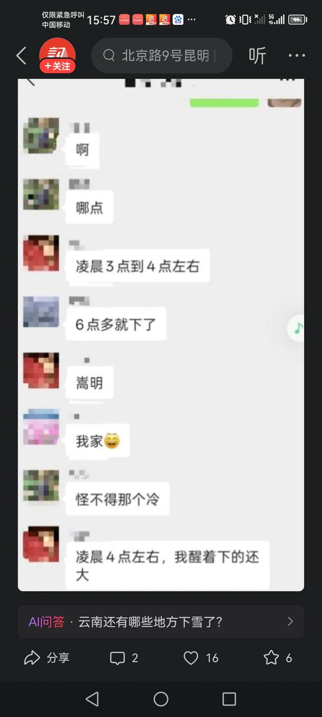 昆明下雪了 昆明的下辖一个县崇明下雪了 其实昆明的下面一个叫轿子雪山的地方下雪更早,昆明的主城区五区内是没有下的,而且一年也是很少见雪的。 这几年的天气一年比一年反常,现在在农历的9月30,到过年还有90天3个月,冷得这么早,今年昆明应该是还会延续去年的见到的雪的场景,这几年全国,全球的气候都是多变复杂的,作为春城的昆明也不会独善其身。不知道从几千上万公里西伯利亚飞来的小精灵们有没有想到,现在的昆明怎么会冷得这么早,但是昆明的气候在省会城市算是最好的之一了吧!海鸥们会不会继续往玉溪抚仙湖及往西双版纳那边飞,西双版纳的气候冬天算是我觉得更完美的城市了。以上仅供参考,属个人意见!