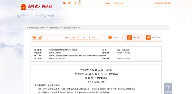 你们《关于设立珲乌高速石头口门收费站收取通行费的请示》(吉交联发〔2025〕51号)收悉。经研究,现批复如下: