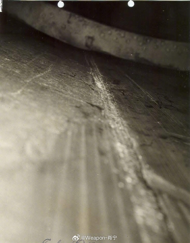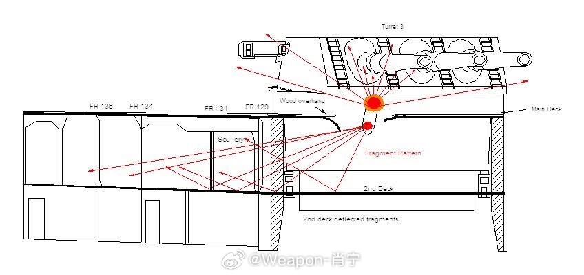 在1942年11月14日至15日晚间的瓜达尔卡纳尔岛第二次海战中,美国海军南达科他号战列舰(BB-57)的三号炮塔基座侧舷被日本战列舰/战列巡洋舰雾岛号发射的14英寸炮弹击中。这组照片展示了炮塔基座及邻近甲板的损伤情况,包括一张基座内部撞击区域的特写和一张弹着点示意图。该14英寸炮弹击中基座后发生横向旋转,以"底座拍击"的方式在基座上引爆。该区域炮塔基座装甲厚度达17.3英寸,被14英寸炮弹弹头撞击处形成深度1.5英寸的凹痕。关于这枚炮弹究竟是14英寸被帽穿甲弹还是轰击弹,至今仍存争议。若为被帽穿甲弹,其风帽与被帽很可能在水平贯穿甲板撞击基座前就已脱落。