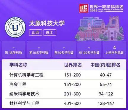 新黄河客户端获悉,近日,2025“软科世界一流学科排名”正式发布,太原科技大学上榜学科从2024年的2个增至4个。其中,计算机科学与工程、冶金工程学科进入前200名,纳米科学与技术、材料科学与工程学科进入前500名,标志着太原科技大学学科内涵建设取得显著成效,彰显了该校强劲的学术发展态势与持续提升的综合影响力。