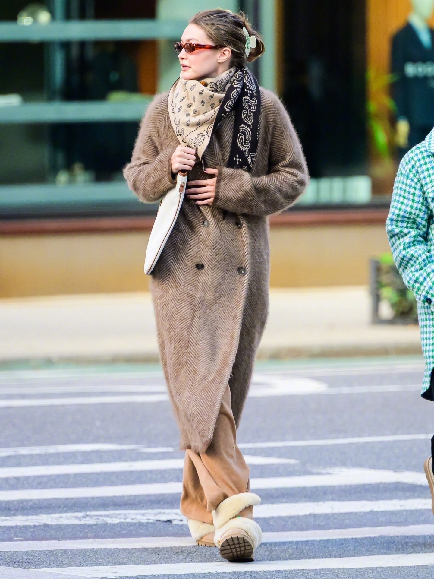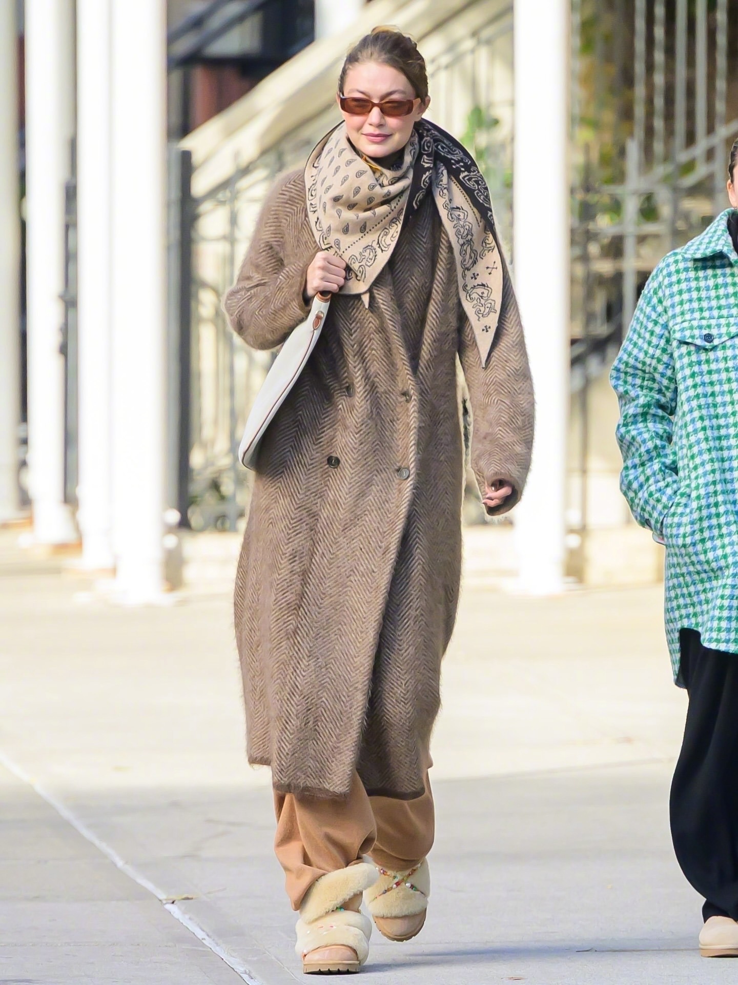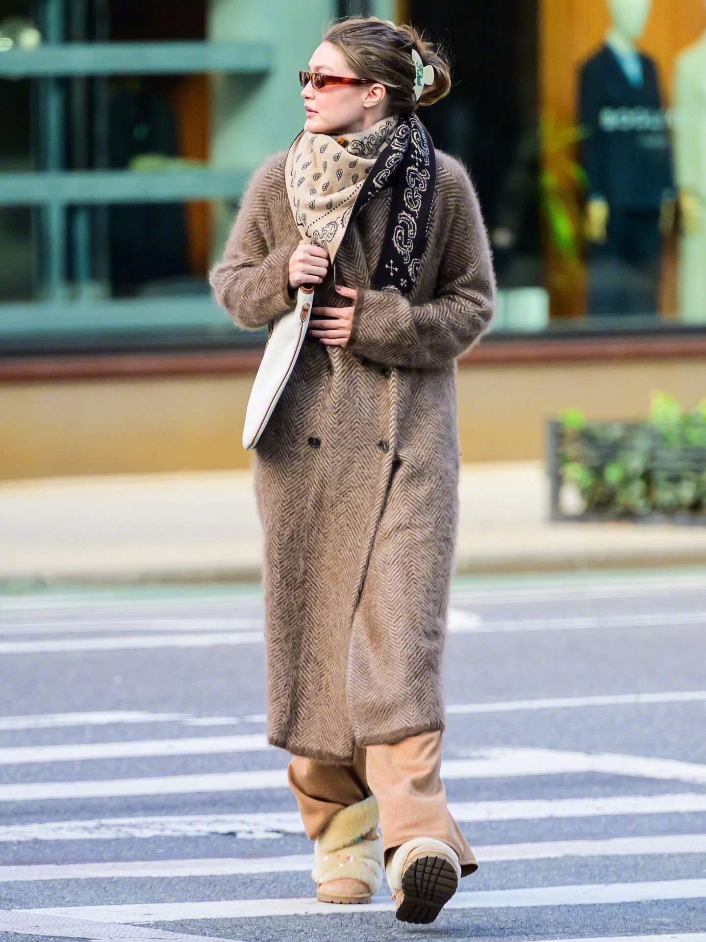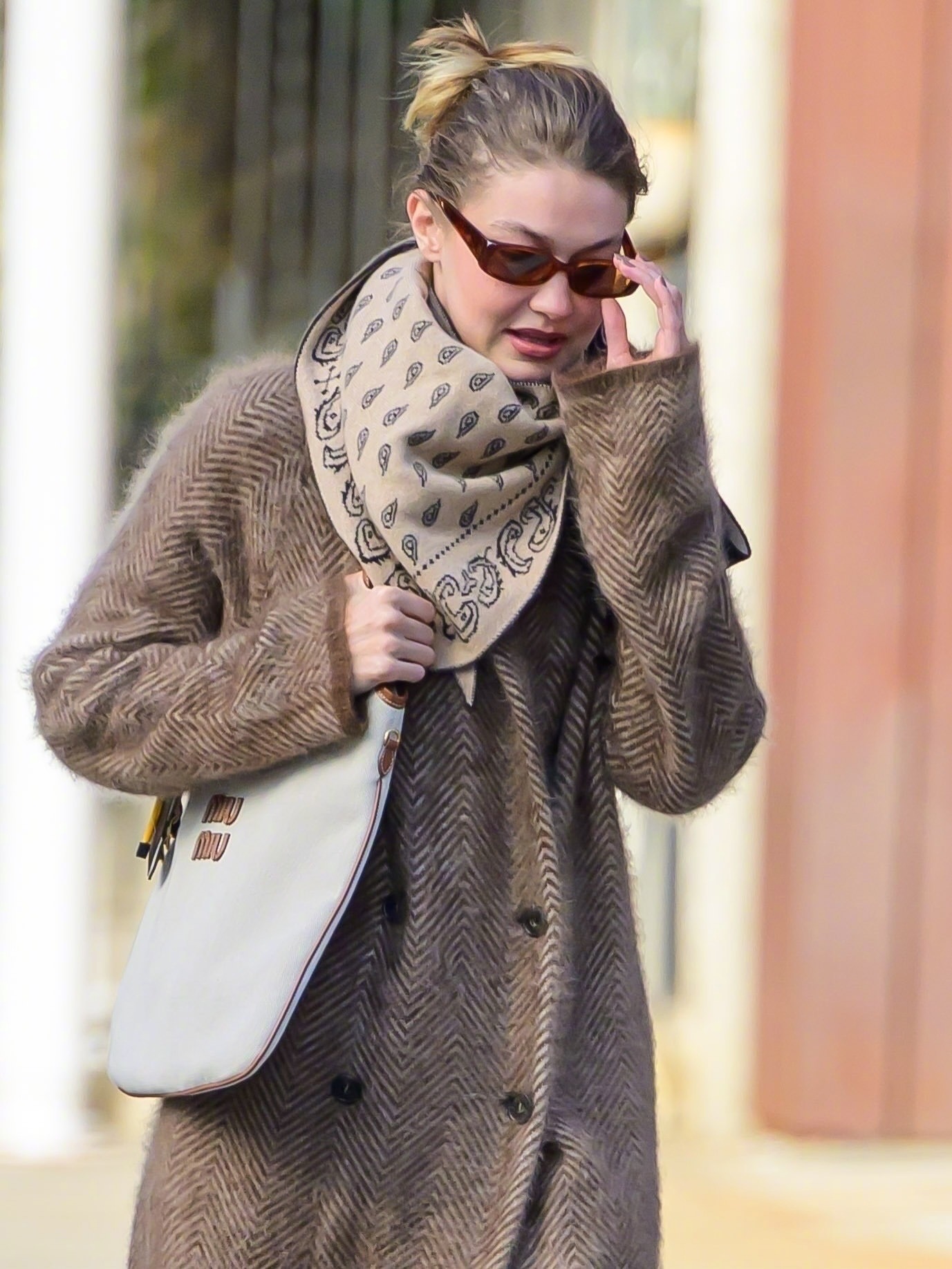 Gigi Hadid 在纽约外出的街拍。肩背Miu Miu 包包,身穿的应该是她自己品牌的羊绒大衣。前几天还与男友布莱德利·库珀一起现身宾夕法尼亚州费城的老鹰队对阵雄狮队比赛。