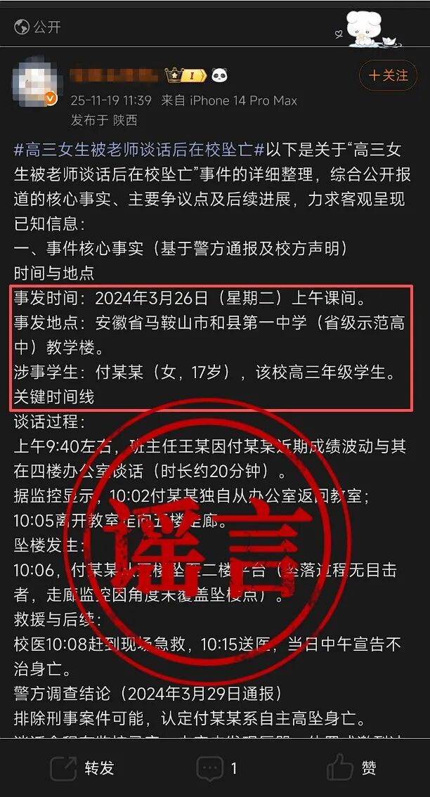 经和县教育局核实,网传“安徽省马鞍山市和县第一中学高三女生被老师谈话后在校坠亡”为谣言信息。2024年和县辖区学校未发生高三学生校内坠亡事件。