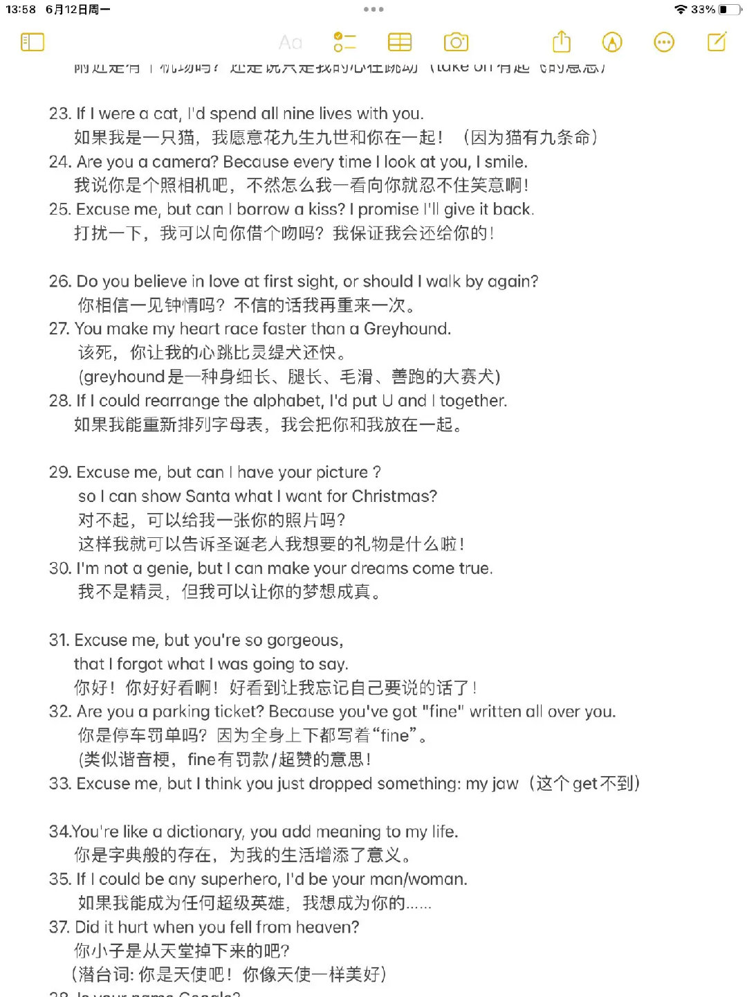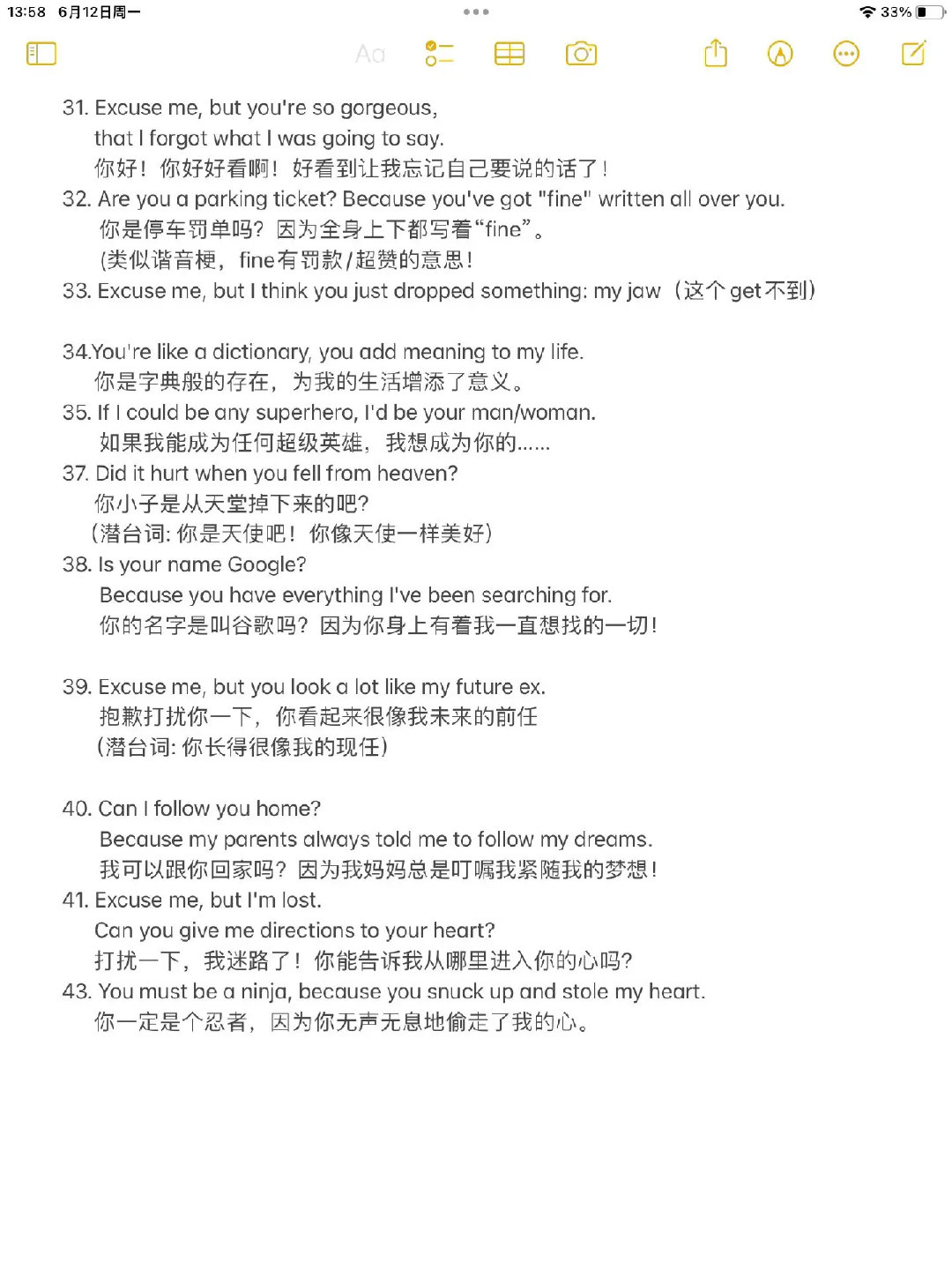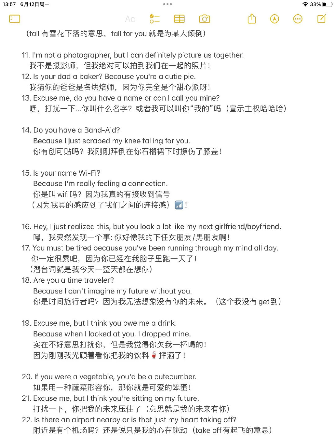 43条超有趣的英语土味情话来啦~ 像“你是WiFi吗?我接收到信号了”“你好看得让我忘了要说啥”这样的句子,每句都戳中恋爱小心思!你觉得哪句最甜?