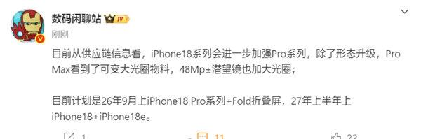 苹果也要一年两发布了,从2026年开始,苹果的iPhone 手机发布节奏有重大变化,预计在下半年九月发布iPhone18 Pro系列+折叠屏系列(终于来了),换到第二年上半年发布iPhone18标准版和青春版系列。这样一来一年就有两次苹果春晚了? 为什么这样操作呢?分析认为采用高端系列和中端系列分开发布,产品更聚焦,九月可以强化高端会更被瞩目。采用上半年强化标准版销量。不仅iPhone一年可以高高强度曝光两次,也可以填补发布周期太长的弊端,上半年也有新机刺激市场。 如果明年苹果折叠屏如期而至,肯定会成为爆款。一年双发,也会给国内手机厂商更大的压力。