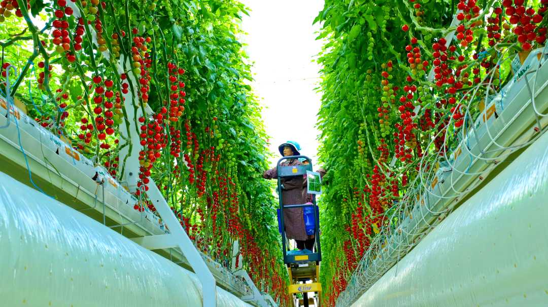 11月18日,甘肃省张掖市甘州区三闸镇三和智慧农业产业园,工人在现代农业智能温室工业化蔬菜栽培车间里进行“串番茄”苗的疏叶。