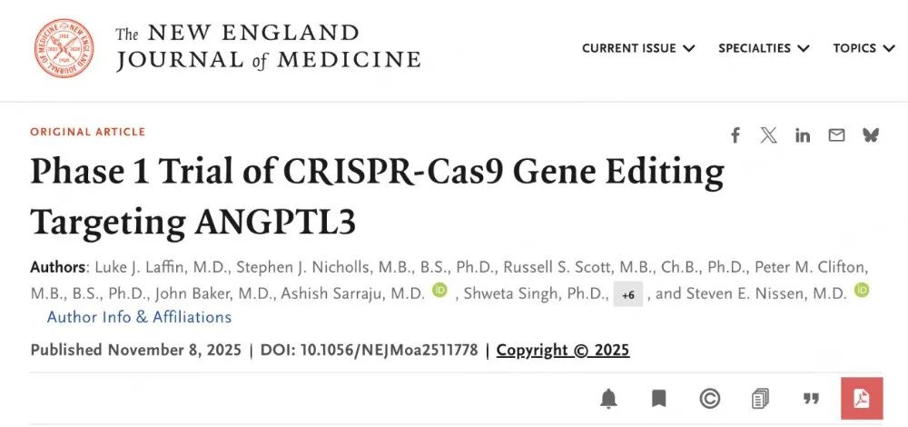 11月8日,顶刊《新英格兰医学杂志》发布基因编辑疗法CTX310的I期临床试验结果,在高脂血症患者接受了基因编辑后,他们的低密度脂蛋白胆固醇(LDL-C)、甘油三酯(TG)等指标显著改善,安全性良好。