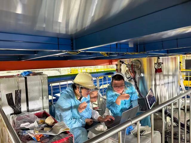 2025年8月25日上海交大博士后惠加琪(右一)、博士生李瑞(左一),博士生张平(中间)在正式物理取数前进行全面刻度。