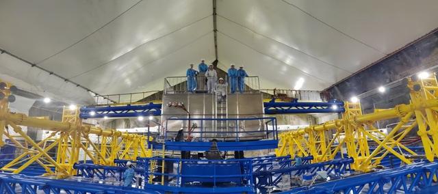 JUNO研发团队历经多年攻关,在高探测效率光电倍增管、超高透明度液体闪烁体、超低本底材料和精密刻度系统等核心领域实现重大突破。JUNO的核心探测器为有效质量达2万吨的液体闪烁体探测器,安置于地下实验大厅44米深的水池中央。直径41.1米的不锈钢网壳作为主支撑结构,承载了包括35.4米直径的有机玻璃球、两万吨液体闪烁体、两万只20英寸光电倍增管、两万五千只3英寸光电倍增管以及前端电子学、电缆、防磁线圈和隔光板等众多关键部件,共同构建起超高灵敏度的中微子探测系统。