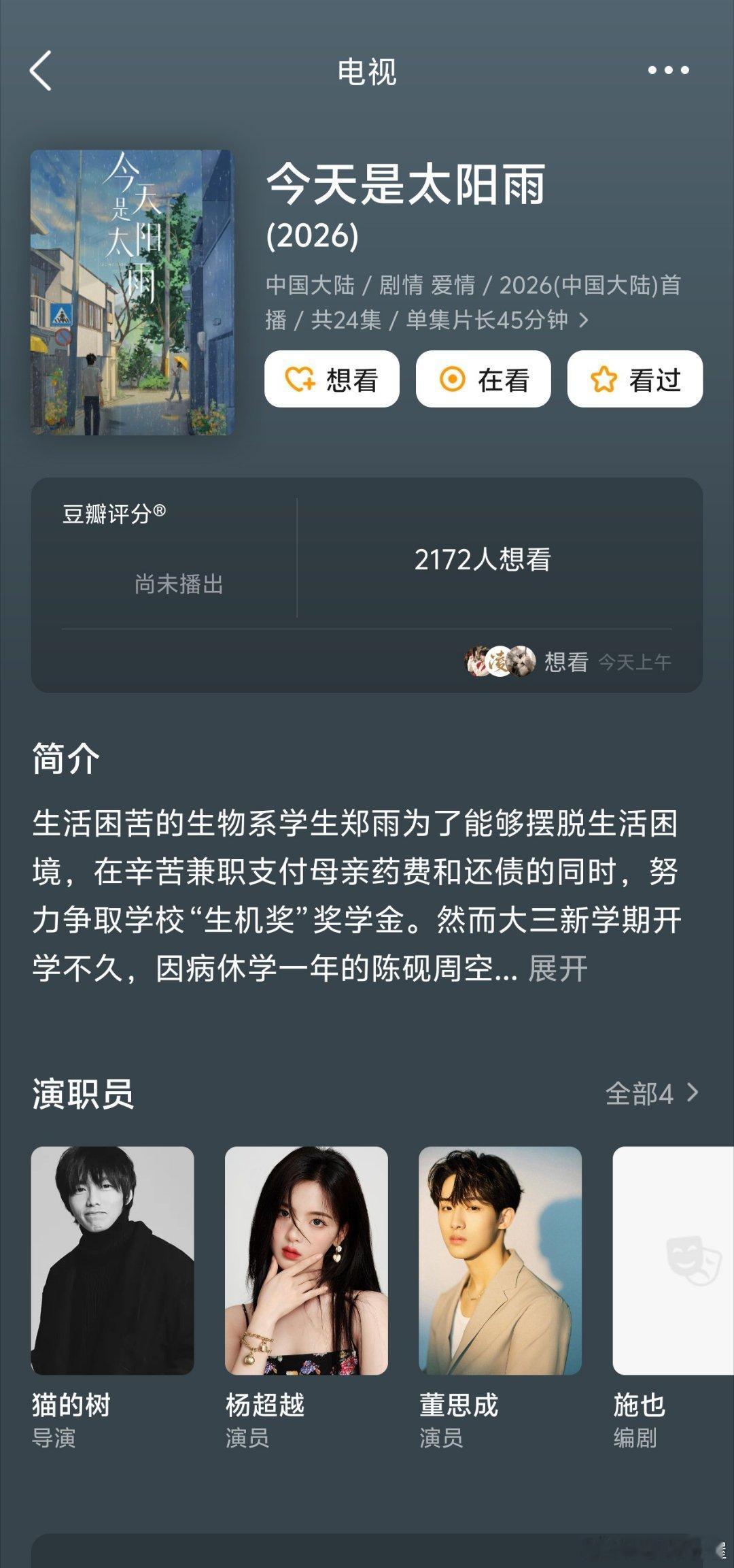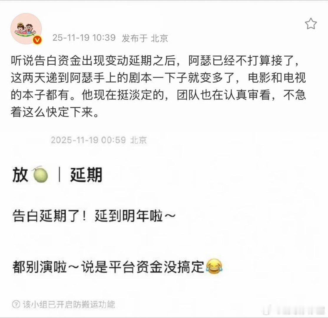 杨超越、董思成《今天是太阳雨》延期到下月初开机王珞丹、宋茜《狂花》延期到12.6开机(目前传过陈飞宇/王星越/王弘毅)《告白》延期到明年影视寒冬这么寒了吗