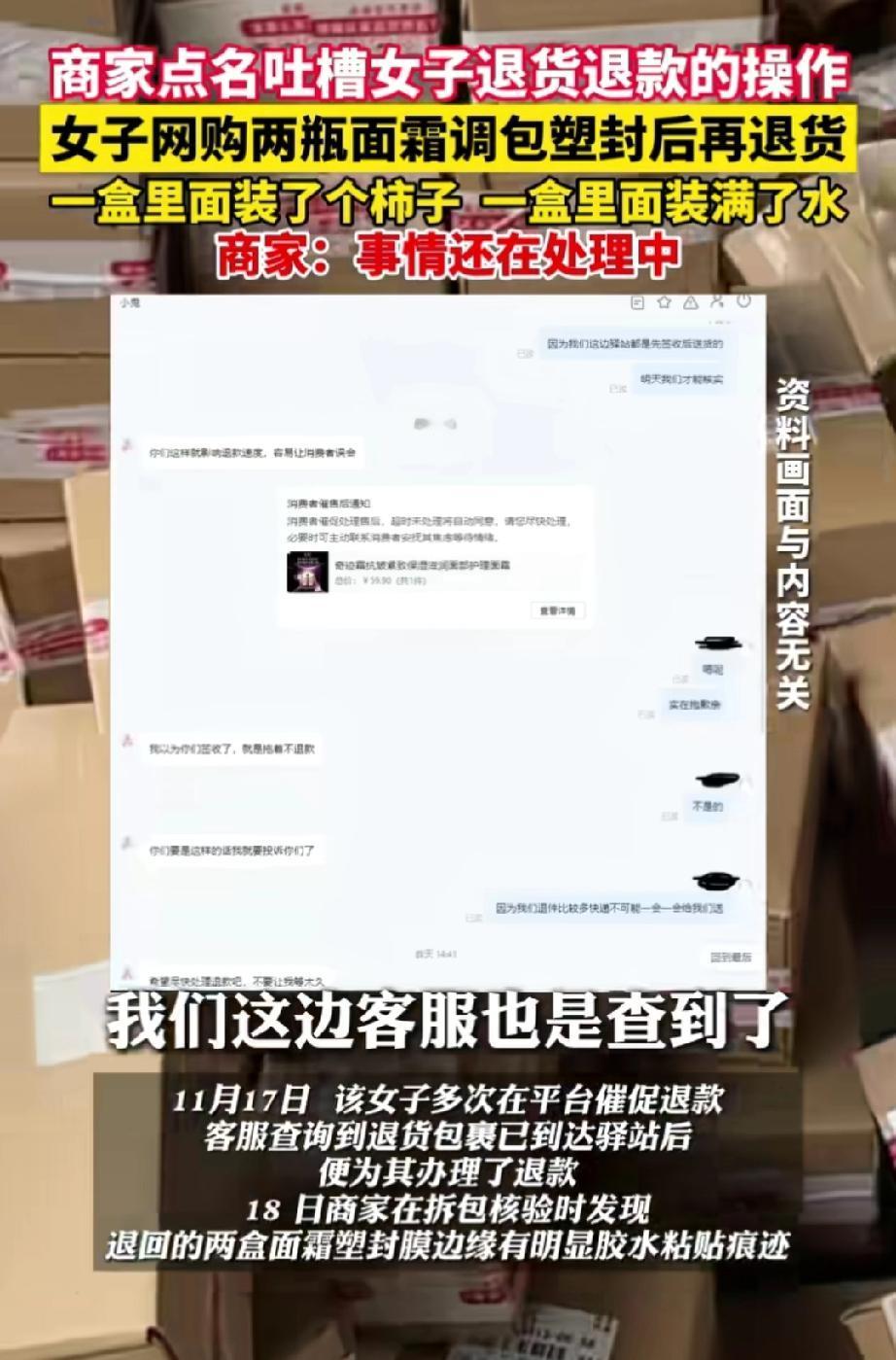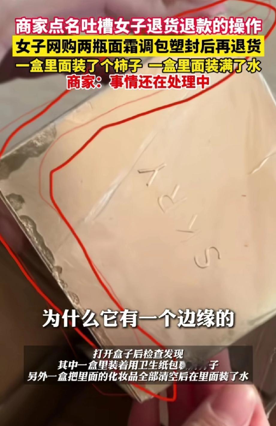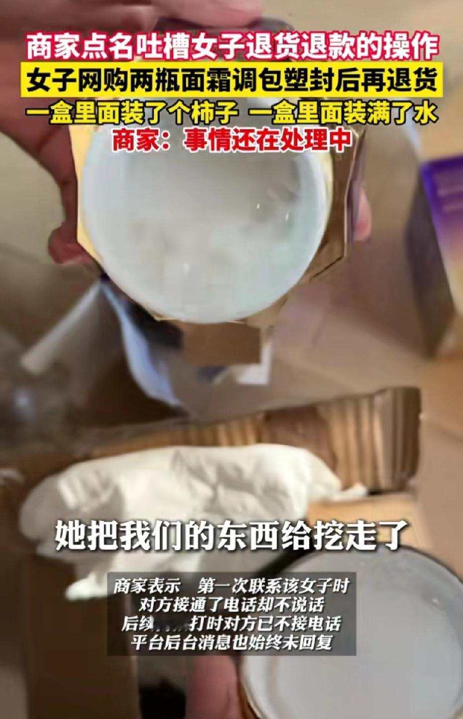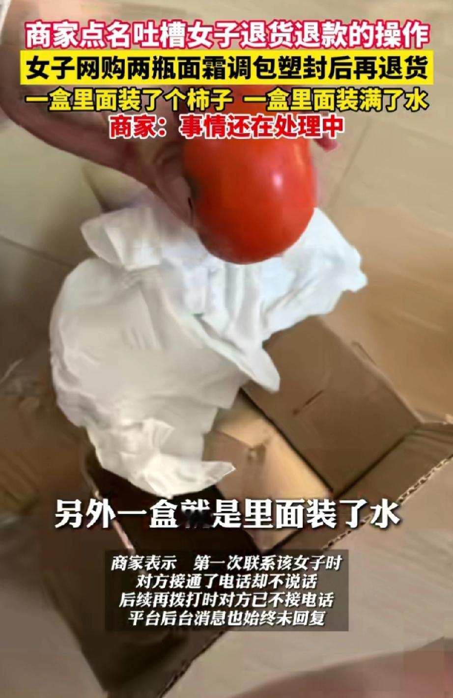 丢人现眼!湖北十堰,一位女子在网上花59.9元买了两瓶面霜,到货后因不满意便要求退货退款。 面霜送达卖家的快递驿站后,女子多次催促快速退款,商家便把钱退给了她。 售后人员取走快递并打开包装检查时,发现包裹面霜的盒子看似完整,但边缘存还有有异样,于是拆开了外包装。 这一检查可把售后人员吓了一跳,一个盒子里竟装着一个柿子,另一个盒子里,面霜被挖走,瓶子里还给灌上了水。 售后人员立刻联系女子,女子接了电话却一声不吭。再次拨打时,电话号码已被拉黑。 网络平台上怎么呼叫女子都不回复。 商家将此事曝光在网上,想让女子给个说法。 说不定女子留的地址也是假的。 这件事中,女子有“白嫖”的嫌疑,但也有可能是快递运输过程中出了差错。 不过商家也有失误,为何不先查验货物再退款呢? 这就是坚守流程的重要性,不要给某些人留下占便宜的空间。 商家信任顾客,才下没有检查之下就退款。而女子为了59.9元的一时贪念,却能输掉无价人品——那是立足世间的根本。为这点蝇头小利撕破体面、透支信誉,实在得不偿失。 建议商家在女子居住地报警,即使没有明确住址,只要有电话号码,警察就能找到她,让她退款并且进行训诫与教导。 来源:江北融媒