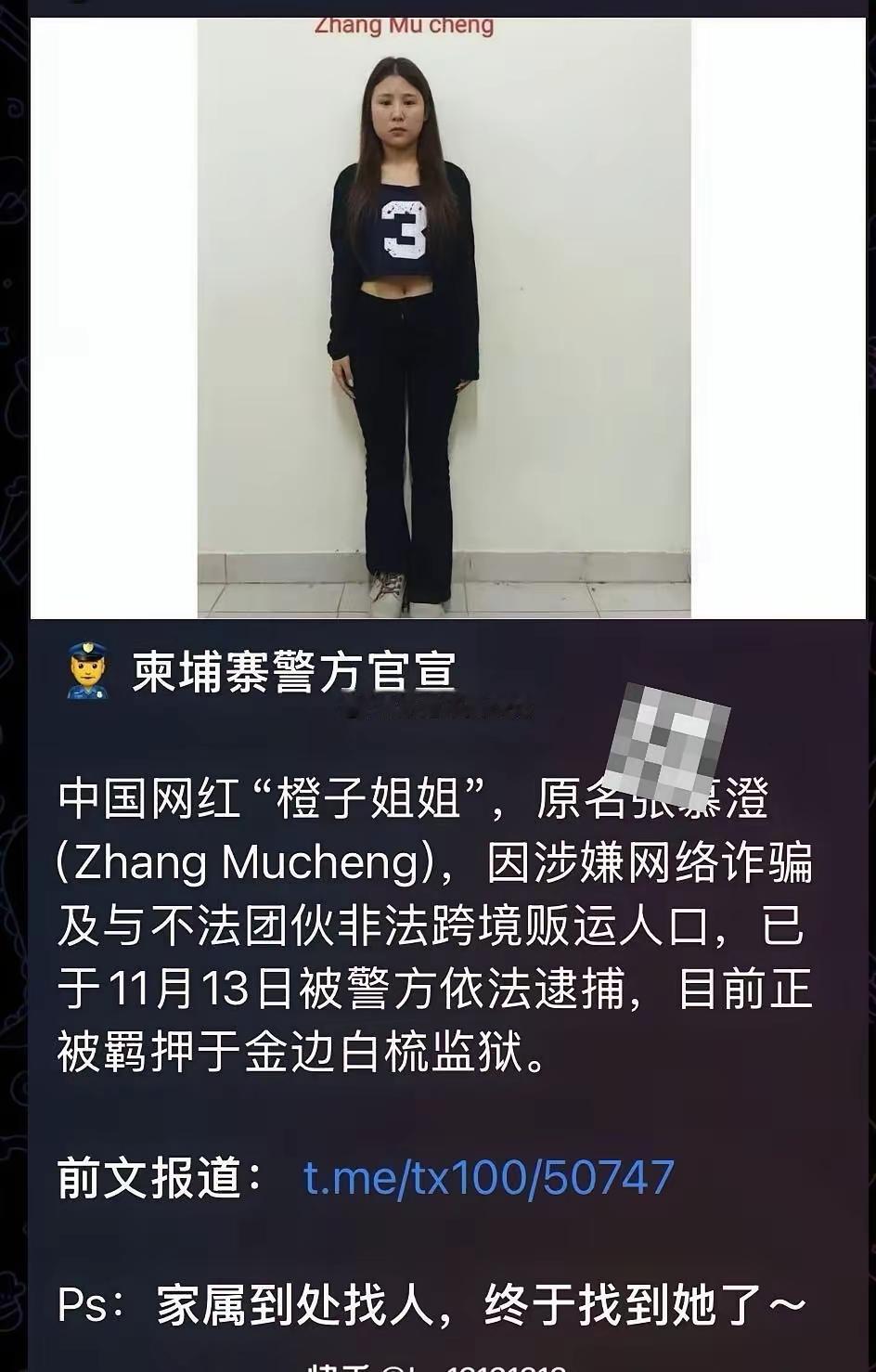 人们担心牵挂失联的网红橙子姐姐,有了消息: 她不是是猎物,她是猎人!!! 有关报道柬埔寨警方官宣,真名为:张慕澄,网名为橙子姐姐,拥有十几万粉丝的网红,因诈骗和贩运人口被羁押于金边的监狱中! 橙子姐姐家人,对其失联后,发文寻找,很多有爱心的网友,认为她是遇到精聊;被男朋友卖了;还有人劝她不要去…… 现在传来了她的消息,她在警局,希望好人平安,坏人受到法律惩处! 哪个母亲说的被囚禁的怀孕女儿有没有消息?橙子姐 柬埔寨打假