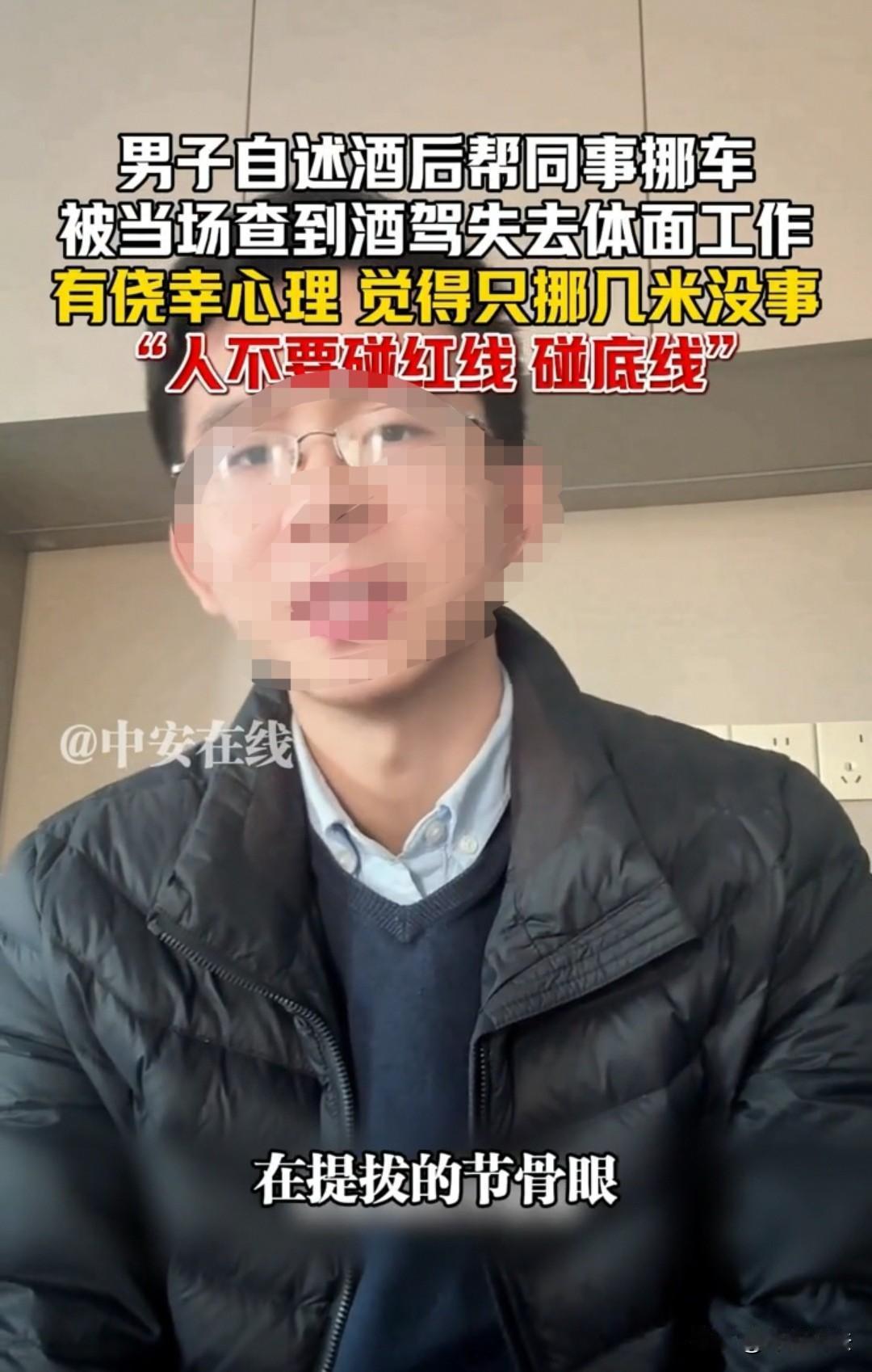 陕西,一名男子是公务员,马上就要提拔了,可就在这个节骨眼上,他去参加同学的生日宴。结果同学喝得比较多,让男子帮忙挪一下车,没想到他刚动车就被查了。最后,他的铁饭碗没了,多年的努力也付诸东流。他面对镜头忏悔,告诫大家一定不要有侥幸心理,千万不要触碰红线。 男子看起来才20几岁,年龄不大。他讲述着自己的人生经历,并且诚恳地告诉大家,一定不要有侥幸心理。 他面对镜头娓娓道来,说自己大学毕业那一年,碰上了国家的好政策,通过特招去了新疆当公务员。 到岗后,他也勤勤恳恳工作,把自己所学的知识都运用到工作中,领导非常欣赏他,准备提拔他。 可是就在这个节骨眼上,他轮休时遇上同学的生日宴,于是就前去参加了。 大家都知道,在酒席上哪有不喝酒的?他当天也没有开车,心想喝酒也没关系,再说多年不见的同学邀请自己参加宴席,哪有不尽兴的道理? 就这样,大家推杯换盏,喝了不少酒。不过喝得最多的还是他的同学,因为同学实在太高兴了。 酒席结束后,同学拉着男子的手说:今天我太高兴了,喝得也太多了。我的车没停在停车场,还有几米距离,来的时候停车场已经停满了,要不你去帮我挪一挪吧? 男子听说只有几米距离,再加上同学已经开口求助,而同学确实喝得烂醉如泥,根本不能开车,于是就答应了。 他当时也是因为双方的关系,才勉为其难答应的。他其实也知道,酒驾被抓住后果很严重,尤其是他这种公务员身份。 不过后来他又想,要是直接拒绝,以后同学之间的关系肯定会有裂痕。再加上当时已经是凌晨一两点钟,他觉得大冬天的,不可能还有交警查岗,于是便大着胆子坐上驾驶室,开动了车子。 可就这短短几米的距离,他还是被交警查到了。结果可想而知,他的铁饭碗没了,更别说提拔的事情了。 男子也认罪认罚,他不知道中间到底出现了什么问题,但至少清楚自己触犯了法律红线,不能怪任何人,只能怪自己,怪自己没能坚守底线。 这么多年过去了,他已经释怀了,但心里还是有不甘,可那又怎么样呢?曾经拥有的一切,都因为这短短的几米路程,全部葬送了。 他虽然后悔,但也无济于事,只是觉得亏欠自己的父母。父母含辛茹苦把他养大,供他读书,眼看他终于有能力反哺二老,却突然发生这样的事情,让父母再次陷入生活的窘境。 不过男子最想告诉大家的是,不管你身处哪个岗位,千万不要存在侥幸心理。除了喝酒后不能开车,生活和工作中也不能有侥幸心理,一就是一,二就是二,否则最后后悔的只有自己。 网友们也在猜测,当时他是不是被人举报了,但这并不是事情的关键。关键在于,男子原本有更好的选择,能拥有更好的前途。他当时完全可以直接找个代驾,让代驾帮忙挪车,这样一来,结果也许就会截然不同。 一、男子挪车行为已构成酒驾,需承担行政责任:酒驾认定核心看车辆是否在道路上行驶及血液酒精含量,只要车辆启动并在道路行驶,哪怕仅几米,且血液酒精含量≥20mg/100ml,就构成酒驾。 依据《道路交通安全法》第九十一条,他会被暂扣6个月机动车驾驶证,并处1000元以上2000元以下罚款。若酒精含量≥80mg/100ml,则构成醉驾,涉嫌危险驾驶罪,还会被依法判处拘役并处罚金。 二、公职身份使其面临额外纪律处分,丢工作符合法律规定:公务员不仅要受交通法规约束,还需遵守公职人员纪律要求。 若只是普通酒驾,会受诫勉教育、通报批评等党纪政纪处分,而提拔资格必然会被取消; 若达到醉驾被追究刑事责任,依据相关规定,会被直接开除公职,这也是他最终失去“铁饭碗”的法律依据,其处分结果完全符合《公务员法》及党纪处分相关规定,不存在违规之处。 对于此事,大家如何看待呢?素材来源于中安在线,2025年11月19日报道