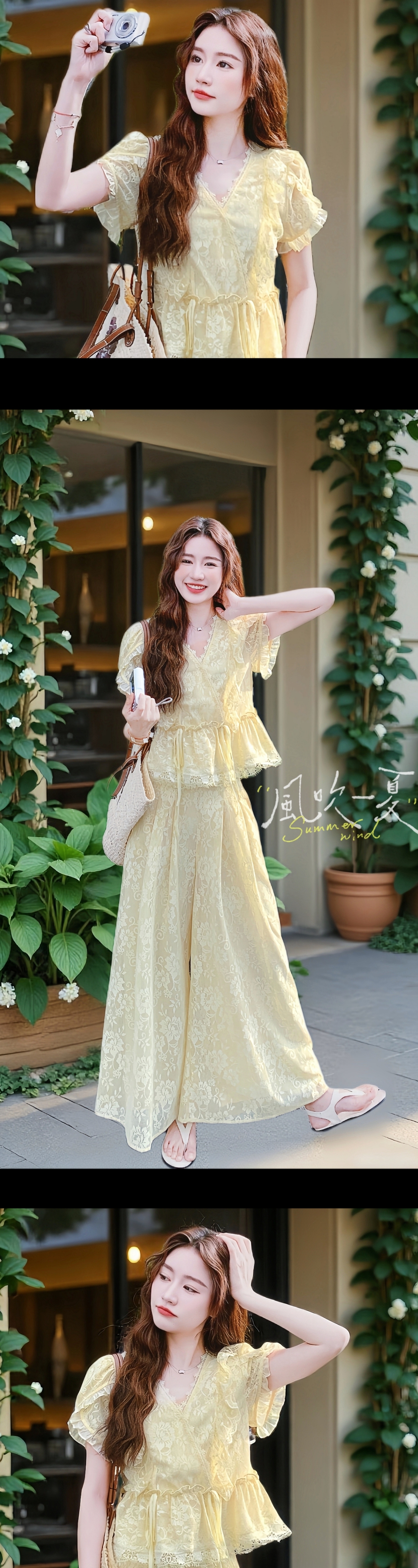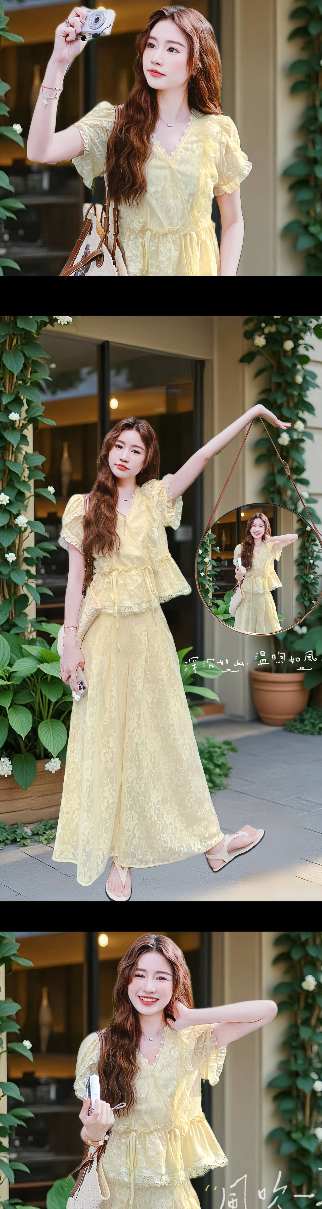 温柔氧气感 | 淡黄色蕾丝套装 V领蕾丝上衣 小飞袖+荷叶边下摆 甜...