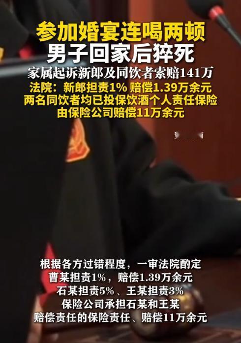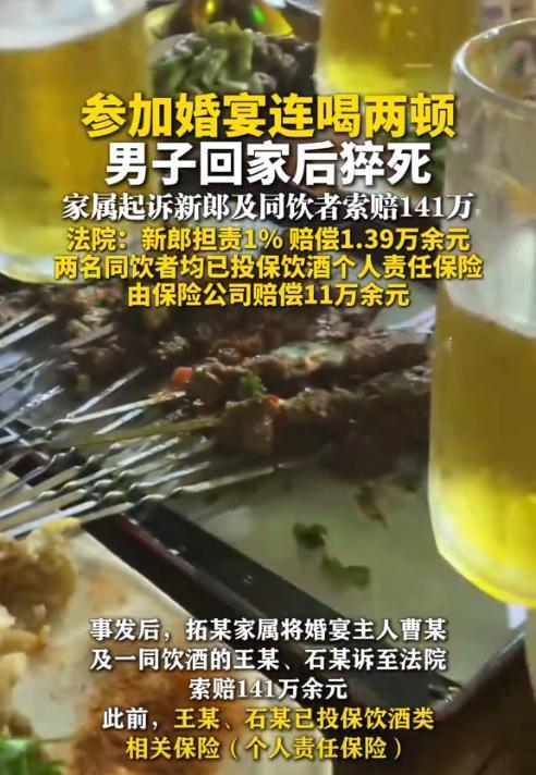 内蒙古,一男子参加婚宴的夜场,与众朋友一起喝了白酒。结束后觉得不过瘾,又去吃了烧烤喝了点啤酒,可谁知男子回到家后却不幸猝死。男子的家属认为,男子是酒喝多了才死的,所以将婚宴主家、同饮者以及保险公司告上法院,索赔141万余元。法院判了!(来源:裁判文书网,内蒙古自治区准格尔旗人民法院) 男子拓某与曹某是十分要好的朋友,这曹某结婚,拓某必然前往。席间,拓某与朋友石某一桌,二人你一杯我一杯的,4杯半的白酒很快就下肚了。 婚宴结束后,拓某觉得没喝尽兴,于是拉上石某,又联系了朋友王某一起去吃烧烤。王某还点了6瓶啤酒,拓某又喝了点啤酒。之后便回家睡觉了。 万万没想到,次日凌晨,拓某在家中死亡。等家属察觉不对时,拓某已经死亡多时。后经鉴定,拓某是突发心源性猝死。 可是家属不理解,拓某没有心脏病历史和心脏基础疾病,怎么会心源性猝死?家属怀疑拓某是喝酒太多死亡,于是将一起喝酒的石某和王某,以及曹某和保险公司都告上了法院,要求他们共同赔偿死亡赔偿金、被扶养人生活费等,共计141万余元。 据悉,王某和石某都投保了个人责任险,就是为了防止和朋友一起喝酒出意外。 《民法典》第1172条规定,二人以上分别实施侵权行为造成同一损害,能够确定责任大小的,各自承担相应的责任;难以确定责任大小的,平均承担责任。 其实对于侵权责任纠纷,只要明确了过错方与因果关系,就可以确定曹某等人是否需要承担责任。 按理说,曹某宴请拓某吃酒席,酒是拓某自己要喝的,那出了问题应当由拓某自担责任。 但是法院认为,曹某作为婚宴的主人,其有义务保障拓某等宾客的安全。虽然曹某没有劝酒等不当行为,但曹某应该提醒拓某少喝点,或者在发现拓某喝多时进行劝阻。可是从调查结果显示,曹某并没有劝阻。 因此,法院认为曹某有一定的过错,需要承担一定的责任。 至于石某和王某,石某与拓某在婚宴上以及烧烤摊上总共喝了两场酒,石某应当意识到拓某已经喝了不少白酒,所以在喝啤酒时,应当作出合理的提醒以及劝阻行为,但石某却陪着拓某一起喝了两场,未尽到任何提醒义务。 而王某在明知拓某已经喝了不少酒的情况下,仍没有阻止拓某继续喝啤酒,也存在一定的过错。 最后这保险公司,依据保险合同条款的规定,其需要为石某和王某承担相应的赔偿责任。 因此,法院酌情认定,曹某应当承担1%的责任,石某承担5%的责任,王某承担3%的责任。其中,石某和王某的赔偿责任由保险公司承担。 其余的责任由拓某自行承担,因为拓某是一个完全民事行为能力人,他对于自己的酒量应当有一定的了解。拓某明知自己在婚宴上喝了4杯半的白酒,结果还认为不够尽兴,然后去喝了1瓶啤酒。 由此可见,拓某对自己的身体健康存在放任恶化的过错,所以拓某自身应当承担主要责任。 最终,法院判决曹某赔偿拓某家属1.3万余元,保险公司需要赔偿11万余元。