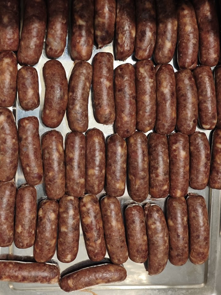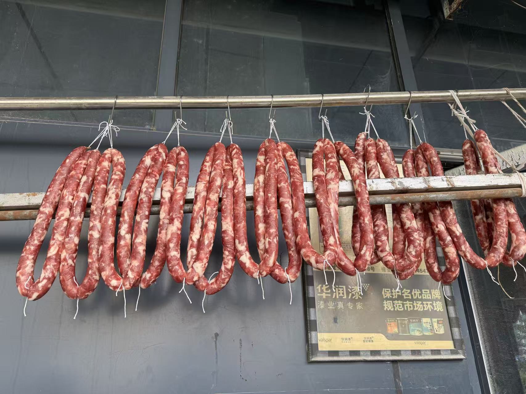 加工的人排长队,等等要小半天。有人不耐烦等,要么起早,要么赶晚,也有人直接买于师傅提前灌好的鲜肉肠,土猪肉38元一斤,普通猪肉的33元一斤。