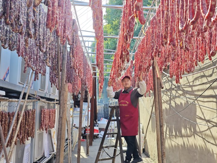 “11月6日开市,提前做准备工作。”于师傅边说边带我到市场外面的一间小院,这里是他的“肉林”,1000斤悬挂着的香肠正在光合作用,风干,鲜红诱人,“这都是老客预订的,再有两三天就可以快递发货。”