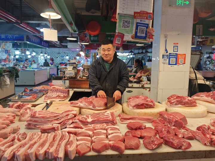另外有一对中年夫妻,在于师傅隔壁不远处的猪肉铺现场买肉,猪肉15元一斤,他们买了40斤,算14元。