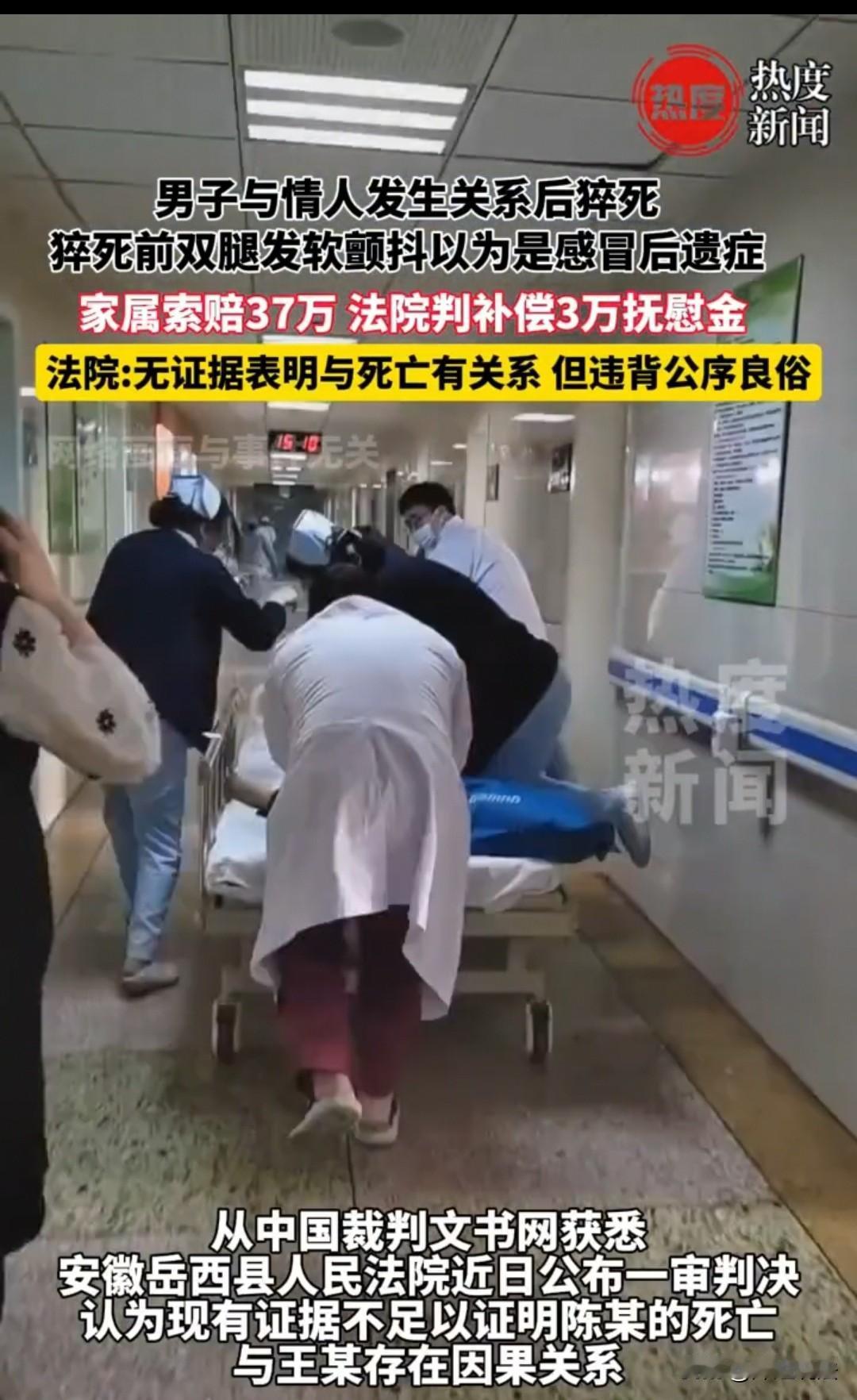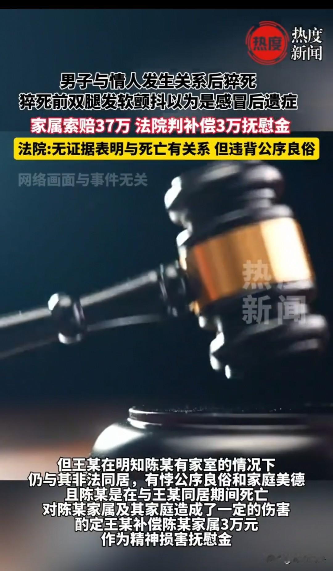 安徽,女子和陈某非法同居,在女子洗澡的时候,陈某给她递毛巾,她就发现了陈某腿部发软,还不停地打颤,女子还劝陈某去医院看一看,可是陈某说没问题,就是感冒的后遗症,到了凌晨的时候,陈某突发疾病去世了,后来家属向女子索要37万赔偿,女子说自己也没对陈某做什么,他是自然死亡的,拒绝赔偿,最后,法院还是判决女子有过错,必须赔偿家属3万元。 王女士认识陈某多年,也知道对方有家庭,但是她就是喜欢陈某,哪怕背上骂名,她也要和陈某在一起。 陈某呢,家中红旗不倒,外面彩旗飘飘,谁不喜欢呀?既然王女士喜欢自己,那就接受呗。 就这样,陈某成了家外有家,还和王女士同居了起来,也会一同抚养王女士的儿子。 就这样,陈某在外面呆的时间还比在家里呆的时间多,自己的老婆是知道的,但是又没有办法,就只能任由他玩够了再回来。 就在2023年的10月19日,陈某又去到了王女士那里,两人很久不见,大白天的就激情了一番,到晚上的时候,王女士便先去洗澡。 不过她忘记了拿毛巾就呼叫陈某,让他帮忙拿一下,陈某也非常乐意,王女士可比自家黄脸婆好看多了,温柔多了,让他干一点事情,乐意的很。 不过他感觉身体也有点不舒服,给王女士拿过毛巾的时候,腿有点发抖。 陈某对王女士说,好像自己感冒了,怎么没有劲? 王女士听到这样,劝他赶紧去看一下医生,不要因为有什么毛病拖延。 陈某却说,你放心吧,可能就是中午的时候感冒了,吃一点感冒药就好了。 王女士没有多想,觉得陈某说的可能是正确的,因此就洗完澡一同睡下了。 可是到了凌晨的时候,陈某突然动了两下,随后就没了呼吸。 王女士吓坏了,赶紧呼叫陈某,把自己的儿子也惊醒了,两人一起对着陈某开始进行人工呼吸和心肺复苏。 可是还是无济于事。最后120的医护人员也来了,发现陈某是心源性猝死,已经去世了。 随后,王女士赶紧报警,并通知了陈某的家属,让他们赶紧来认领。 家属得知此事后悲痛不已,虽说陈某家外有家,但是老婆还是爱他的,还在等着他回心转意的,这下人怎么就没有了? 随后,他们起诉王女士,认为是她的过错才导致陈某去世的,索要37万。 可是从王女士的口供来讲,她并没有伤害过陈某,陈某发疾病的时候,她和儿子也进行了急救,并没有存在多大过错。 但王女士还是有一定的过错,就是她和陈某同居,那么应该保证陈某的人身安全,但是陈某在傍晚就发现身体打颤不舒服,她却没有带着对方去就医,这也算是过错。 最后判决王女士需赔偿对方家属3万元。 网友们就说,不光是要王女士赔偿,还得让陈某给予王女士的开销也算清楚,那可是陈某和他老婆的夫妻共同财产,怎么能任由王女士获得呢? 一、王女士未强制送身体不适的陈某就医,为何需承担赔偿责任? 《民法典》第一千一百六十五条:行为人因过错侵害他人民事权益造成损害的,应当承担侵权责任。依照法律规定推定行为人有过错,其不能证明自己没有过错的,应当承担侵权责任。 王女士与陈某长期同居形成特殊共同关系,对陈某有合理救助义务,其未采取有效措施的过失与陈某猝死存在因果关系,符合过错侵权要件,故需担责。 二、陈某配偶为何能追回陈某用于婚外同居的夫妻共同财产? 《民法典》第一百五十三条第二款:违背公序良俗的民事法律行为无效。 陈某婚内擅自处分夫妻共同财产维系婚外同居,既未经配偶同意,又违背公序良俗,该处分行为无效,配偶作为财产共有人有权追回。 三、为何法院判决王女士仅赔偿3万而非家属索赔的37万? 《民法典》第一千一百七十三条:被侵权人对同一损害的发生或者扩大有过错的,可以减轻侵权人的责任。 陈某作为完全民事行为能力人明确拒绝就医,自身对死亡结果存在主要过错,依据该条款可减轻王女士责任,这是法院调低赔偿金额的关键。 对于此事,大家如何看待? 素材来源于热点新闻,2025年11月19日报道
