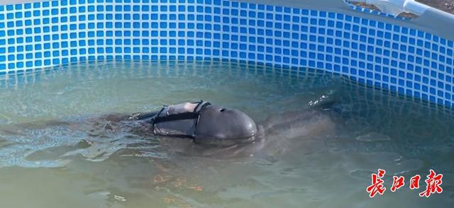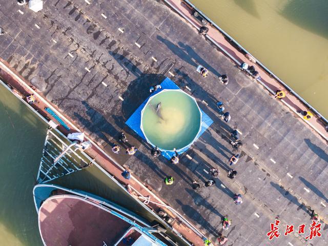 11月14日上午9时,长江日报记者在长江江豚试验性野化放归现场,遇到附近村民胡典强,他激动地伸长脖子张望,“以后长江江豚会越来越多!”18分钟后,两头长江江豚分别由四人用专用担架布,从运输水箱转移至驳船上的“舒缓池”适应20分钟后,被抬至长江水域放归。