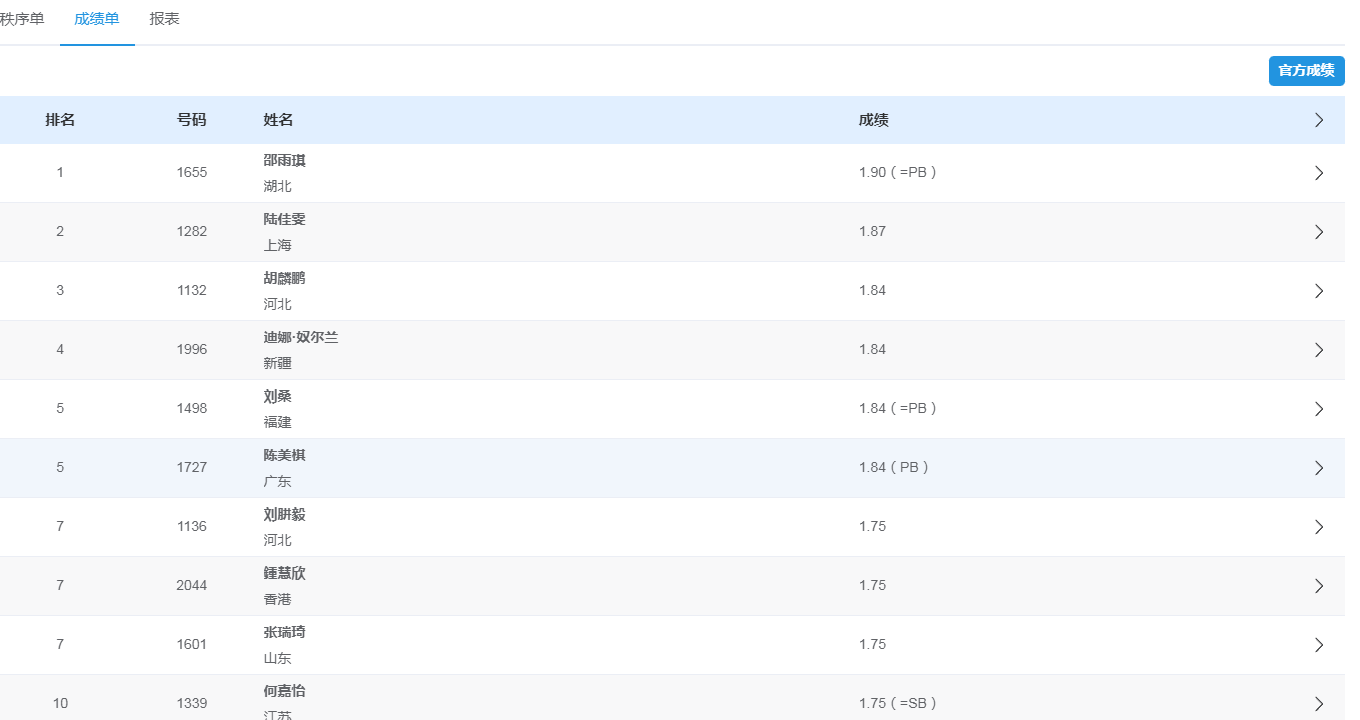 虎扑11月19日讯今晚结束的全运会女子跳高决赛,湖北队邵雨琪以1米90,追平个人最好成绩,获得金牌。