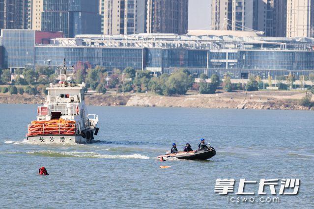 “长沙市水上应急救援指挥中心,我是旅游客船1号,在三馆一厅水域与货船1号发生碰撞,我船船体破损,失去动力,船上20名乘客,有6人落水,请求紧急救助。”“旅游客船1号,请立即自救,我们马上组织救助。”……演练总指挥的一声令下,宽阔的江面瞬间转变为紧张的“战场”:搭载高清摄像头的无人机率先升空,如同敏锐的鹰眼,迅速飞抵“事发”水域上空,进行广域巡查;几艘冲锋舟已如脱缰野马高速驶向落水者,与此同时,无人智能救援艇也自主驶向目标,它行动迅捷而稳定,精准靠近随波起伏的“落水人员”,成功将其“救”上艇身。阳光下,船艇的航迹在江面上划出长长的白色弧线,引擎的轰鸣声汇聚成水上“安全曲”,岸上观摩区也传来一阵阵低声的赞叹。