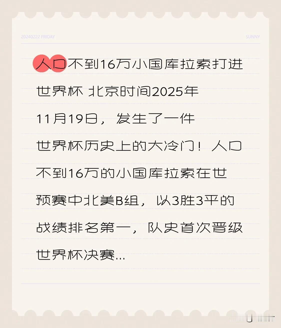 人口不到16万小国库拉索打进世界杯 北京时间2025年11月19日,世界杯历史爆出大冷门!人口不足16万的小国库拉索在世预赛中北美B组,以3胜3平的战绩排名第一,队史首次晋级世界杯决赛圈。 库拉索是荷兰的自治国,面积仅444平方公里。此次它刷新两项世界杯纪录,成为面积最小、人口最少的参赛队。10年前,其FIFA排名仅第150位,如今已升至第82位。球队队员基本在荷兰出生,知名球员有巴库纳兄弟和华裔陈达毅。尽管主帅艾德沃卡特因家庭原因缺席本场比赛,但球队表现稳健,堪称世界杯的一匹黑马! 世界杯南美区 科特迪瓦国足 99支尔瓜多尔 库拉索美女