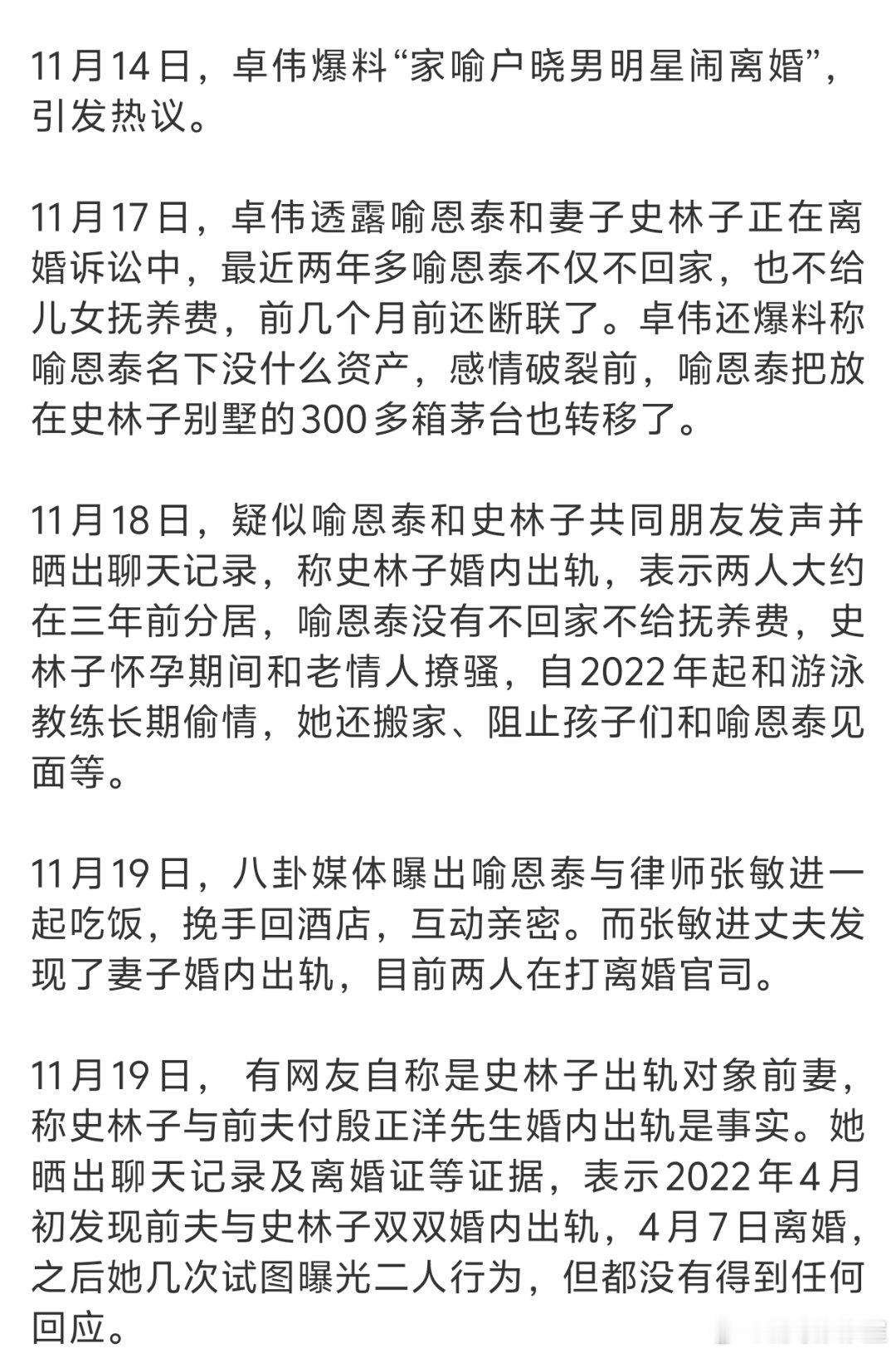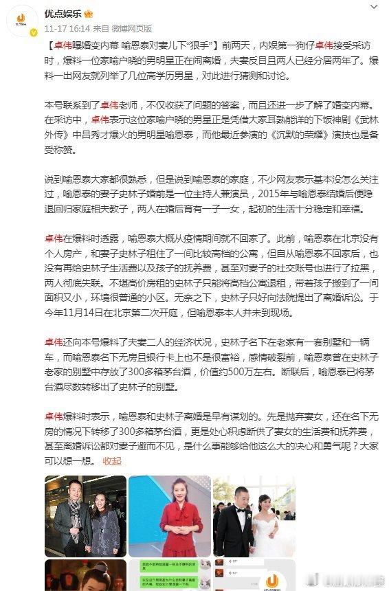 喻恩泰发文回应婚变,秀才上一次发微博还是五年前发博直接回应了4点:为孩子忍辱多年,被离婚旷日持久,被造谣跟拍数月,已报警立案原文如下:1,忍辱多年。为孩子念,家丑自匿。2,被离婚旷日持久,历时三载,只为升米碎银。3,买通狗仔,跟拍数月,捕风捉影造谣言。君子坦荡荡,小人必现形。4,已报警,已立案,有法律,有正义。微博升堂断案,可休矣。