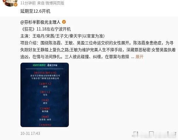 现在有三部戏都延期开机了杨超越、董思成《今天是太阳雨》延期下个月王珞丹、宋茜《狂花》延期到12.6《告白》延期到明年(男主传过陈飞宇、王星越)🤔🤔内娱怎么回事?这么多都开不起来