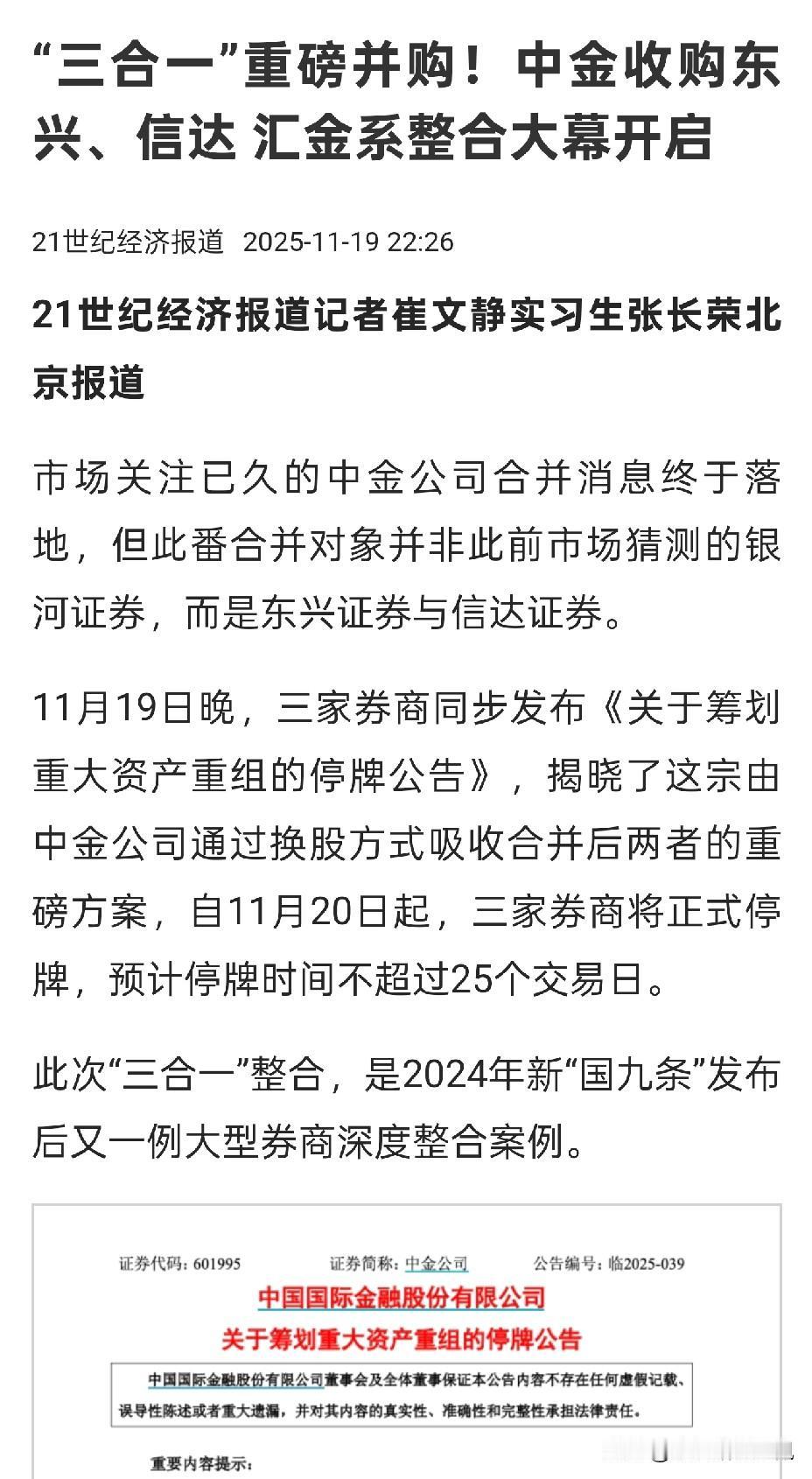 有些人老爱吹某某银行背后是中央汇金,中央汇金又买了多少多少银行等。既然这么爱中央汇金,那一定要关心一下今晚的这则并购重组消息。 中金公司将合并吸收东兴证券,信达证券,组成资产规模超万亿的中央汇金系券商,目标是打造国际一流投行。 也别再傻傻的去比较中美银行股的估值了,人家美国的银行股都是商业银行投资银行混业。动不动就巴菲特投资富国银行如何如何,既然这么喜欢巴菲特投资银行的案例,应该买点银行,买点券商构成组合,那才差不多模拟出来一个国际投行的配置。