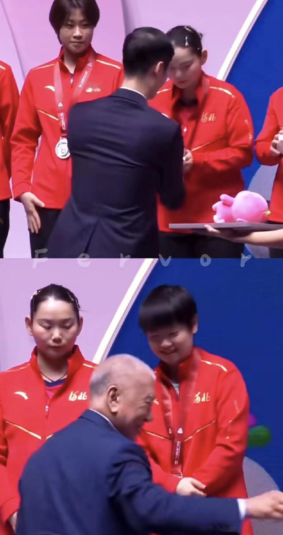 很好奇这个颁奖会上的老人是谁,还对着莎莎笑。 感觉他很喜欢莎莎,从给莎莎戴上奖牌到握手就一直笑,转头拿第二个奖牌的时候嘴角的笑都没压下来。 这是真喜欢莎莎呀。就是不知道是谁? 莎莎这么有团队精神,也难怪会招人喜欢,知道自己也许独砍2分也不一定带河北队赢冠军,但是莎莎依然努力托举着河北队。 这样的姑娘谁不喜欢呢? 网友说,每次孩子锻炼中断想偷懒,就提醒他你想想孙颖莎。孩子就默默的接着锻炼了。 莎莎给人的力量就是很正,充满了动力。谁不喜欢这样的人呢? 再说这个颁奖的老人,你们知道是谁吗?