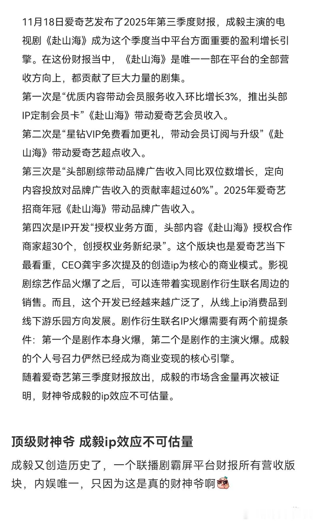 成毅 就是单扛天花板,顶级财神爷赴山海一部联播剧霸屏爱奇艺财报所有营收版块!成毅创造历史,ip效应不可估量!