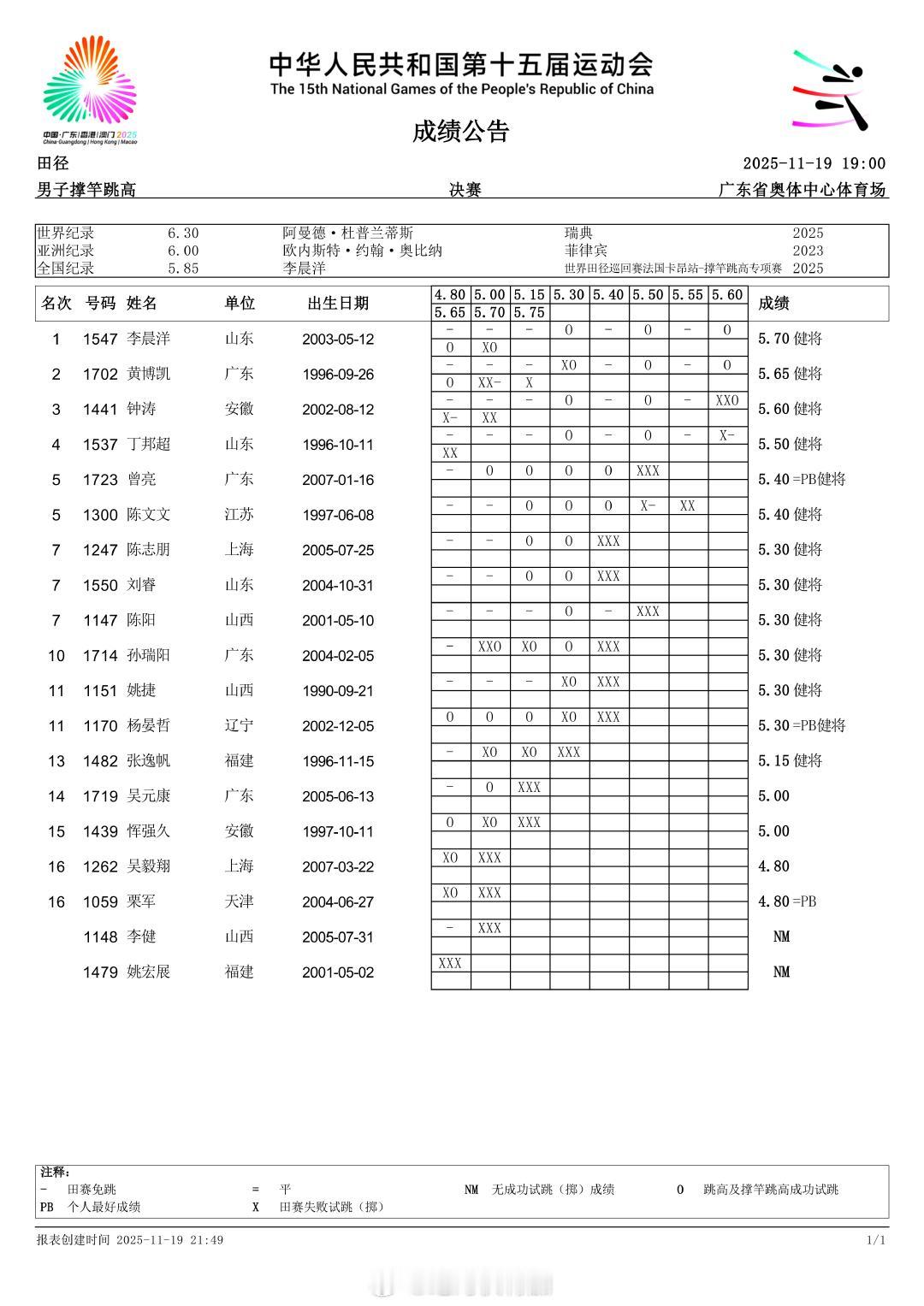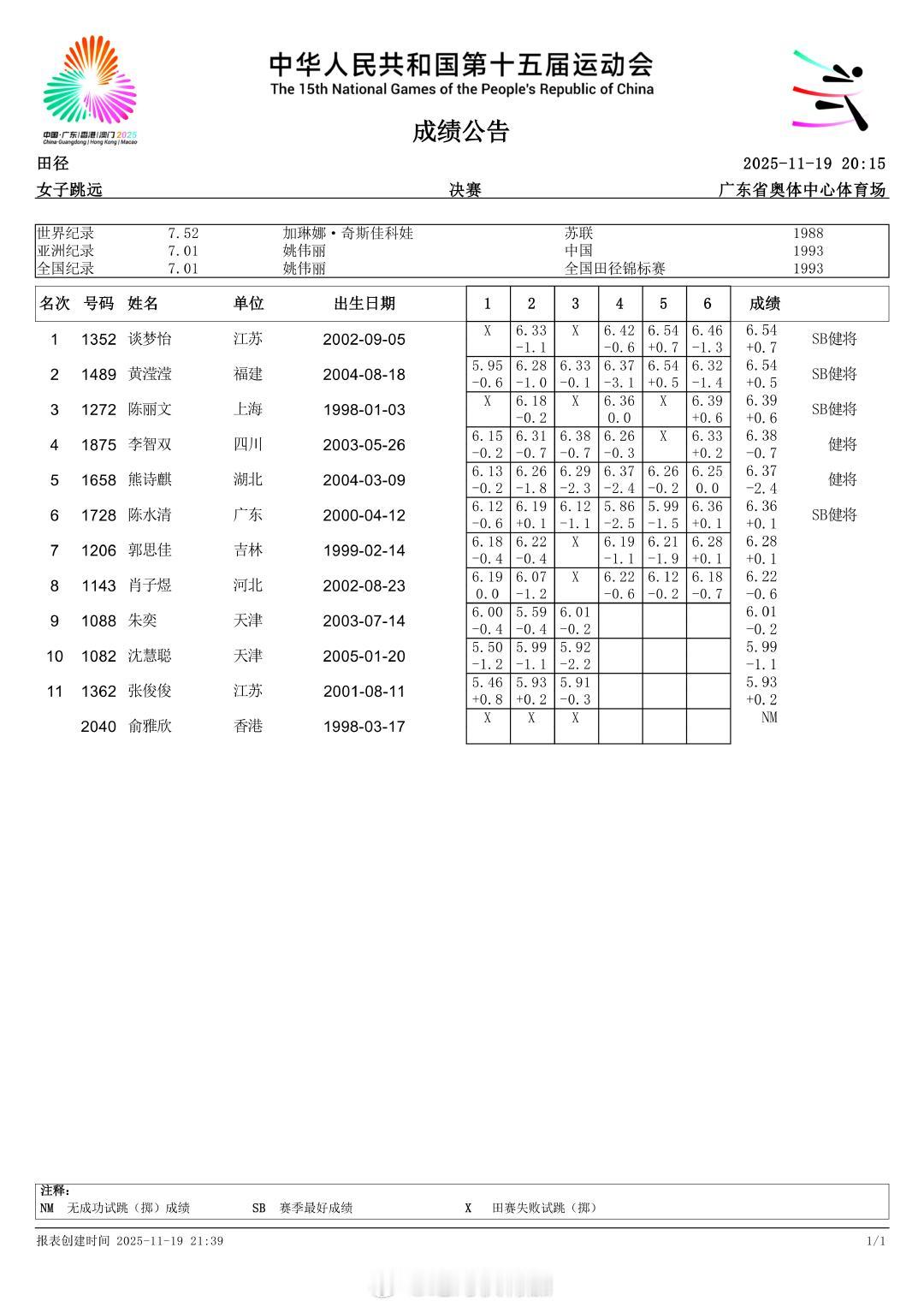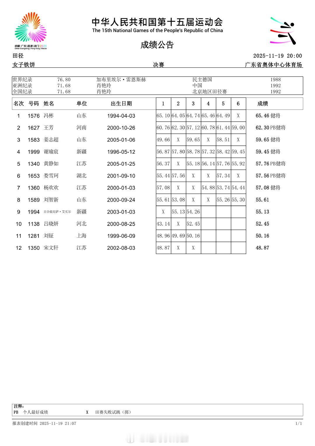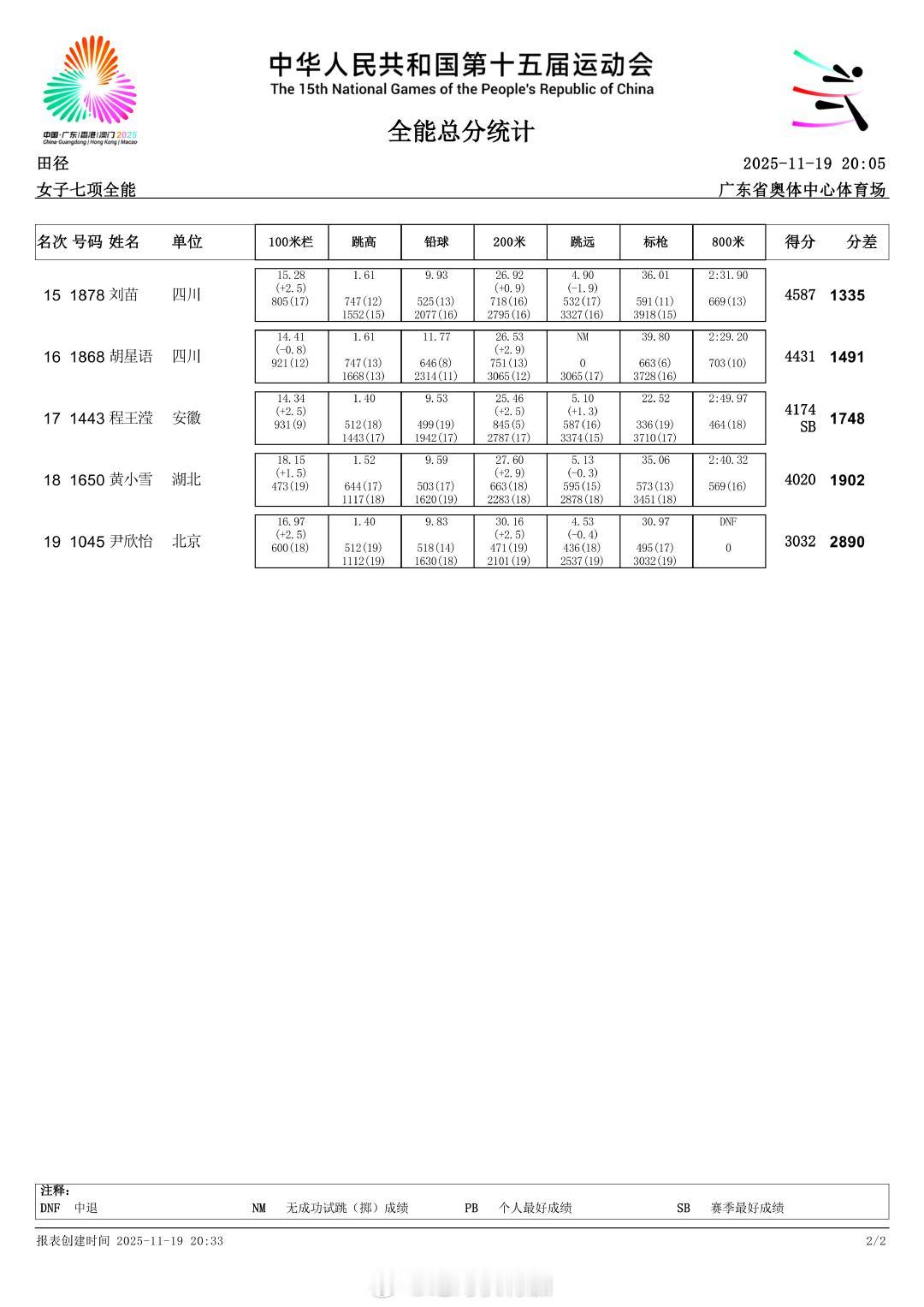 2025第十五届全运会女子七项全能。郑妮娜力不受伤的情况下就依旧是目前国内选手中各项最均衡的一位,除了200米只排在第六位,其余单项都是前三。1、山西 郑妮娜力 59222、浙江 刘静逸 58423、浙江 徐佳欢 5625 PB男子撑竿跳高。1、山东 李晨洋 5.702、广东 黄博凯 5.653、安徽 钟涛 5.60女子铁饼。无悬念。1、山东 冯彬 65.462、河南 王芳 62.30 PB3、山东 姜志超 59.65女子跳远。1、江苏 谈梦怡 6.542、福建 黄滢滢 6.543、上海 陈丽文 6.39