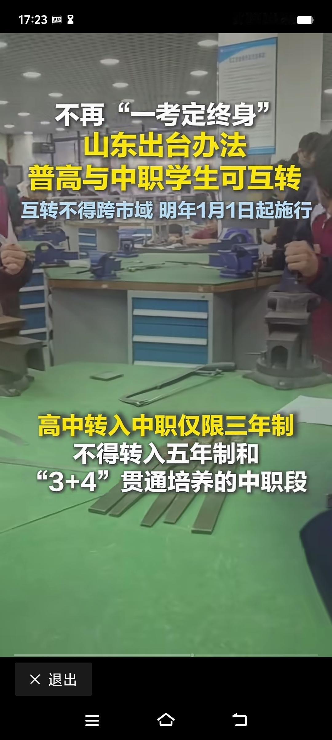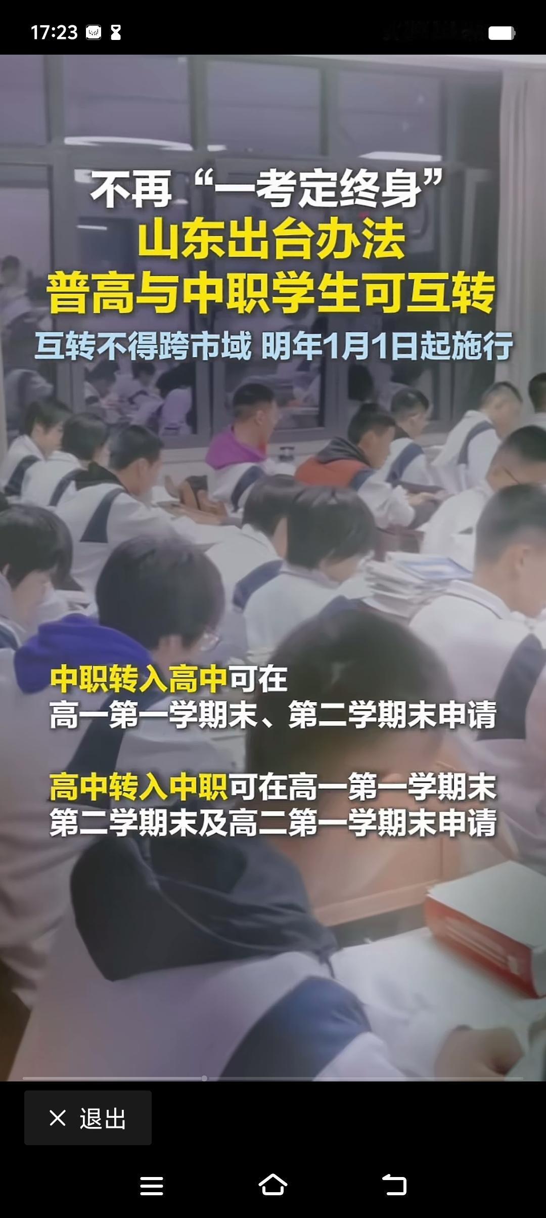 山东2026年参加中考的孩子有福了,再也不用怕中考分流孩子上不了高中了! 很多人都在埋怨,如今的中考比高考都残酷,录取率不足50%,才十四五岁的孩子就去职高混日子,也有人说自己的孩子只是贪玩还没开窍,只要上了高中一定会逆袭将来有一番作为。 好吧,既然你们都这么不甘心孩子去职高,如今机会来了。从2026年1月1号开始,山东将执行职高普高学生互换制度,简单来说,就是满足了部分家长说的,孩子上了高中才开始好好学习的愿望。只要你高一下学期之前确实学的够好,可以申请进入普高继续学习。 而那些虽然进了高中,但一年下来实在是跟不上节奏的人,也可以换个更轻松的赛道,申请进入职业高中。 这样的操作,可以让一部分有需求的学生找到更适合自己的学习节奏和难度,理论上是一件非常好的规定。 但这里边有几个很现实的问题需要解决,首先,众所周知,职高的教材不仅跟普高不同,而且难度比普高低多了。虽然说有人在职高有可能是出类拔萃,可一旦换成了普高的知识,真的能跟得上节奏么? 而且一定要说明每年申请进入普高的人数或比例,以及申请进入普高的标准是什么?只看分数还是其他的?如何能做到真正的公平公正这个需要详细的解析。 其次,换学校的同时,学籍一样互换,这势必会造成一边倒的局面,职高生肯定会一窝蜂的申请去普高,毕竟有了高中学籍可以无限次参加高考。而好不容易有了高中学籍的人,不会这么轻率的就把学籍扔了,到职高去混日子吧?