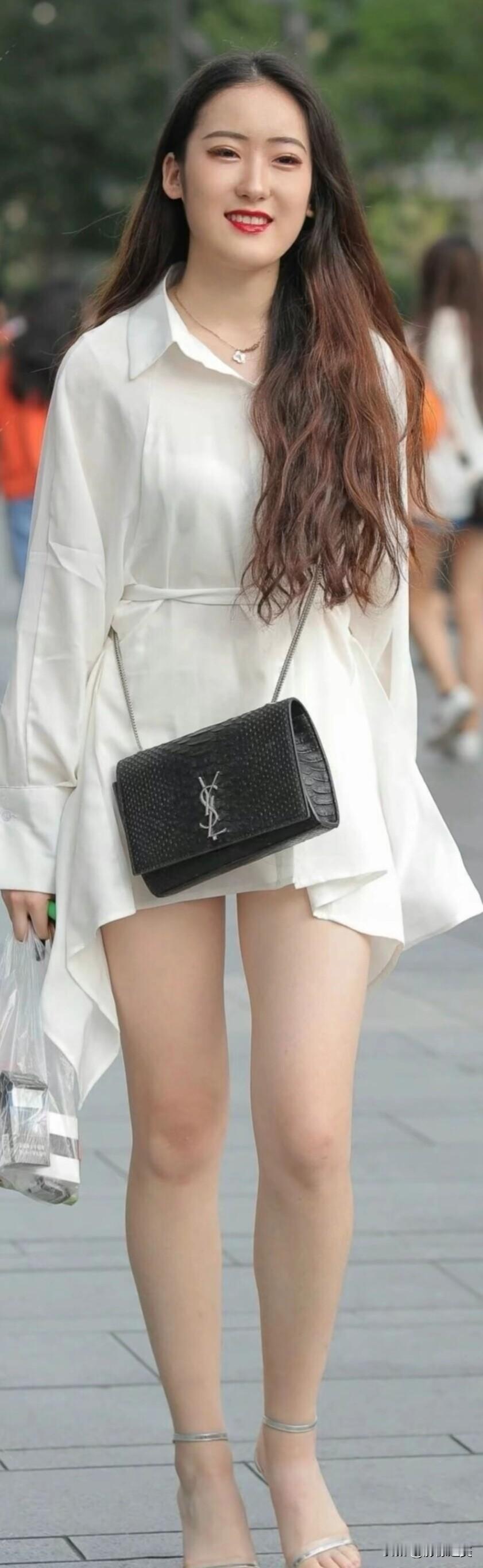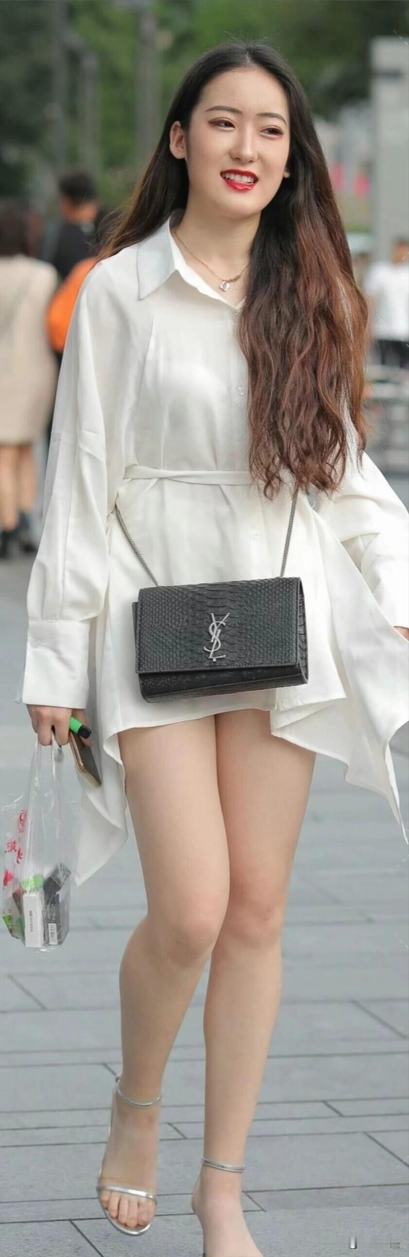 这位时尚小姐姐的穿搭太有看点了!一件白衬衫当连衣裙穿,配白色短裤和银色高跟鞋,肩带斜挎包,又飒又美!