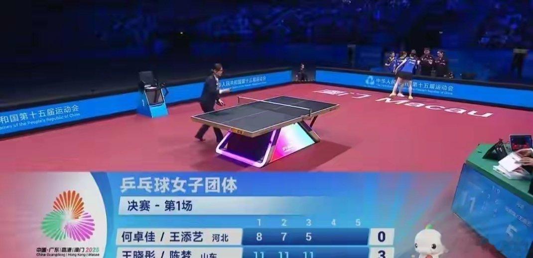 3-2险胜!全运会乒乓球女团决赛山东队夺冠 陈梦独得2分 孙颖莎丢局逆转助队追平11月19日晚间,全运会乒乓球女子团体决赛上演巅峰对决,河北队与山东队展开激烈角逐,整场比赛跌宕起伏、悬念拉满,宛如过山车般扣人心弦。首盘双打较量,山东队组合陈梦与王晓彤配合默契、状态火热,开局便以6-3抢占先机。尽管河北队组合奋力追赶两分,但仍未能扭转局势,山东队顺利拿下首局。第二局双方陷入胶着,战至5-5平后,山东队突然发力打出5-2的进攻波,彻底打乱河北队节奏。第三局山东队延续强势,在5-5平的节点后连得6分,干净利落地拿下双打胜利,为队伍先拔头筹。第二盘单打,山东队派出范思琦迎战河北队的孙颖莎。孙颖莎开局便展现超强攻势,凭借犀利的前三板压制得范思琦难以招架,轻松拿下前两局。然而第三局范思琦抓住机会实现翻盘,以12-10险胜一局。暂停调整后,孙颖莎迅速找回状态,在第四局稳扎稳打,最终以总比分2-1逆转取胜,帮助河北队将大比分扳为1-1平。场边河北队教练组在第三局范思琦翻盘时焦急不已,孙颖莎的逆转则让团队重拾信心。第三盘,河北队的王添艺对阵山东队的陈梦。面对经验丰富的陈梦,王添艺明显显得紧张畏缩,整场比赛全程被陈梦压制。尽管第二局王添艺曾有追分势头,但很快被陈梦重新掌控局势,最终陈梦直落三局取胜,山东队以2-1再次领先,抢占夺冠主动权。第四盘再度迎来单打对决,孙颖莎代表河北队出战,对阵山东队的王晓彤。此役孙颖莎状态神勇,完全掌控比赛节奏,第一局便以8-0的梦幻开局占据绝对优势,让王晓彤倍感压力。第三局王晓彤尝试主动搏杀,但孙颖莎凭借稳定的发挥减少失误,以11-7锁定胜局。整场比赛孙颖莎仅让王晓彤拿到6分,强势为河北队扳回一分,大比分来到2-2平,决赛进入决胜盘生死战。决胜盘由河北队的何卓佳对阵山东队的范思琦,这是两人在本届赛事中的首次交锋,谁能取胜将直接决定冠军归属。范思琦此前与孙颖莎有过交锋,经历过硬仗考验;何卓佳作为老将,同样具备稳健的发挥和抗压能力,河北队教练组也在赛前积极研判局势。此时赛场氛围达到顶点,河北队球迷纷纷为何卓佳呐喊助威,山东队助威团也不甘示弱,呐喊声此起彼伏。陈梦在场边时刻关注比赛动态,活动手腕保持状态,随时准备应对可能的突发情况。随着裁判哨声响起,决胜盘正式开打,究竟是何卓佳助力河北队凭借孙颖莎的两分完成翻盘,还是范思琦再拿一分,助山东队依靠陈梦的两分锁定冠军,最终结果全看两位选手的临场发挥。