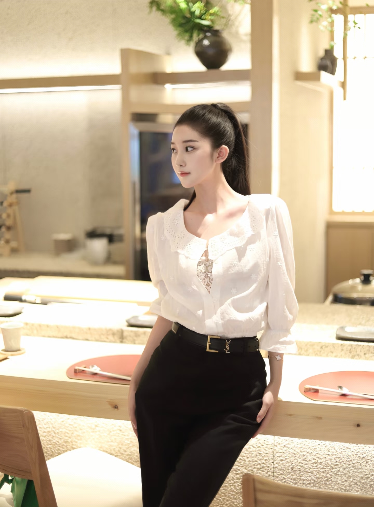 她身着简约白衫,领口精致的蕾丝设计似春日里悄然绽放的花朵,温柔又别致。