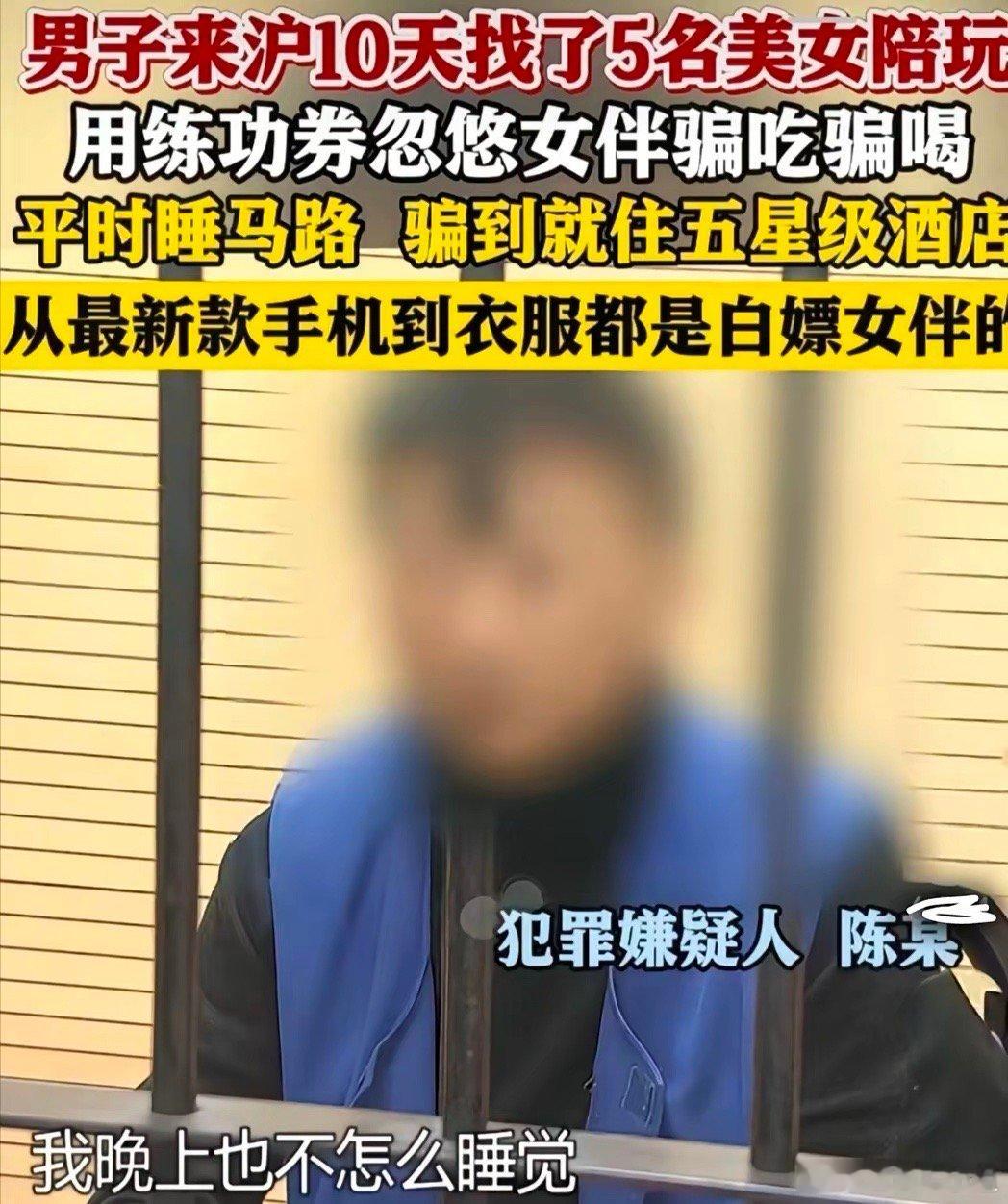上海惊现“顶级白嫖男”!来沪10天骗5名美女近5万,住五星酒店,手段绝了。今天给你们说个离谱到没边的事儿!上海来了个36岁的陈某,小学毕业,没工作后竟动起歪心思,在上海10天时间,把5个美女骗得团团转,骗吃骗喝还白嫖手机衣服,手段那叫一个“绝”!这哥们平时没目标就睡马路,一骗到姑娘就住进五星级酒店。更骚操作的是,他还自己装成陪玩中介,用小号跟美女们联系,并向美女们收10%中介费,把自己包装成“大哥”。和女伴出去消费,他就用黑色袋子装着练功券,你没听错,是银行职员练钞用的练功券。目的是让对方以为是几万块现金,还放进酒店保险箱里忽悠人。结果呢?从最新款手机到一身行头,全是女伴买单!10天时间,就从5个美女那骗了近5万块。被抓的时候,身上的手机、衣服,没一样是自己的,全是“白嫖”来的。你说这手段,是不是刷新了三观?所以啊,奉劝出门在外的美女,一定要留个心眼,别被这种花言巧语的“骗子”给忽悠了。这种人,真该好好尝尝法律的滋味!