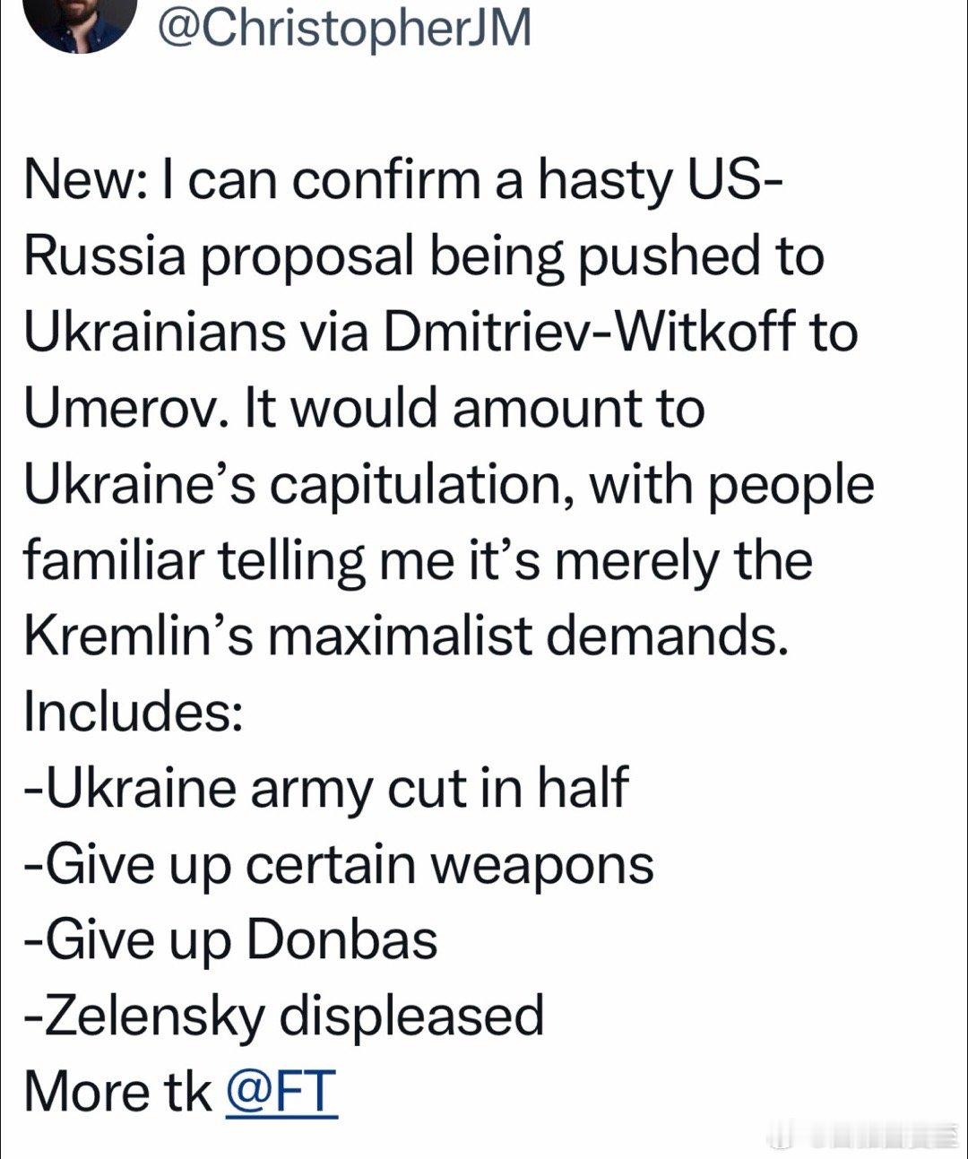 美俄共同制定的新“和平方案”,由美军高级将领访乌时转达:乌裁军一半、放弃先进武器、放弃整个乌东…同时,要求乌与美共享“无人机技术”Zelensky对内容非常不满,因为相当于要求无条件投降