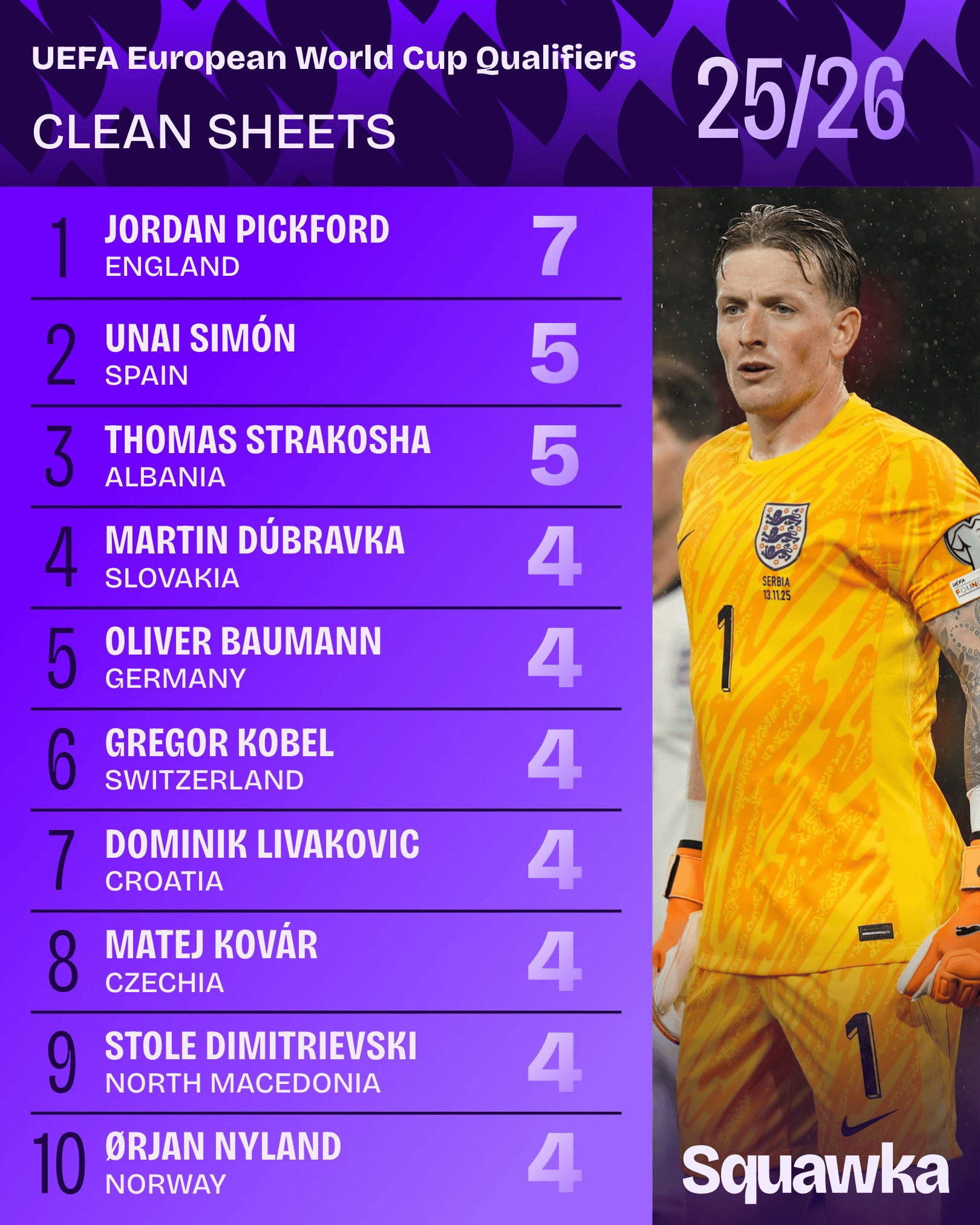 数据网站squawka更新了本届世欧预的零封榜。