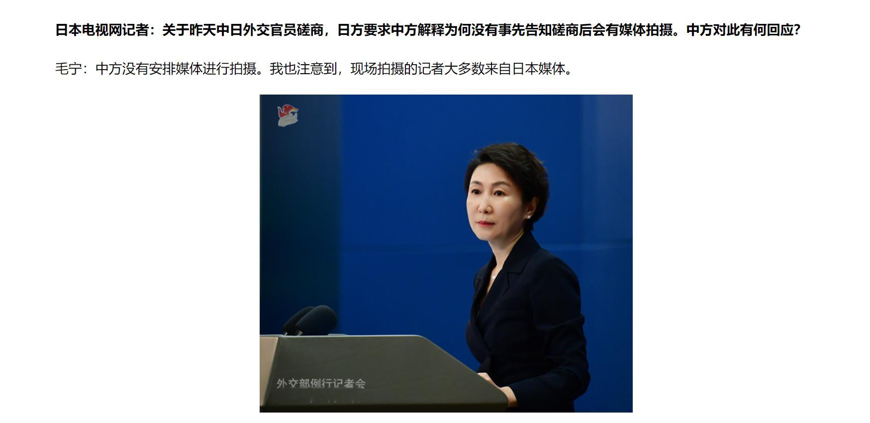 🔻2025年11月19日,外交部发言人毛宁主持例行记者会。🔻日本电视网记者:关于昨天中日外交官员磋商,日方要求中方解释为何没有事先告知磋商后会有媒体拍摄。中方对此有何回应?🔻毛宁:中方没有安排媒体进行拍摄。我也注意到,现场拍摄的记者大多数来自日本媒体。🔻via 外交部网站
