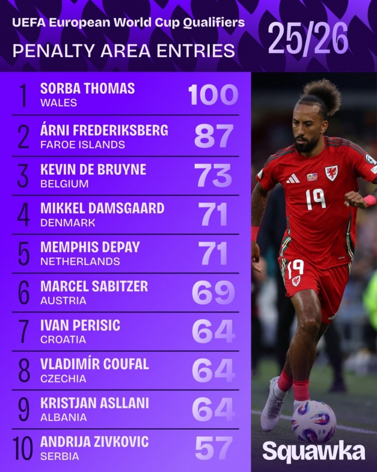 直播吧11月20日讯本届世欧预小组赛已经告一段落,squakwa也统计了本届赛事进入禁区次数情况,威尔士边锋索尔巴·托马斯领跑。