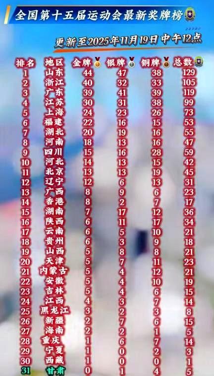 截止到11月19日中午12点,十五届全运会最新金牌榜更新。 山东以44金稳居第一