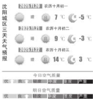 本报讯(沈阳晚报、沈阳发布客户端记者徐佳婷)11月19日,记者从沈阳市气象部门获悉,周四、周五两天,天空依然晴朗,随着弱冷空气的抵达,气温小幅下滑,最高气温回落至7℃至9℃,最低气温-3℃至-5℃,伴随着3~4级的西北风,早晚凉意明显,大家要注意保暖。