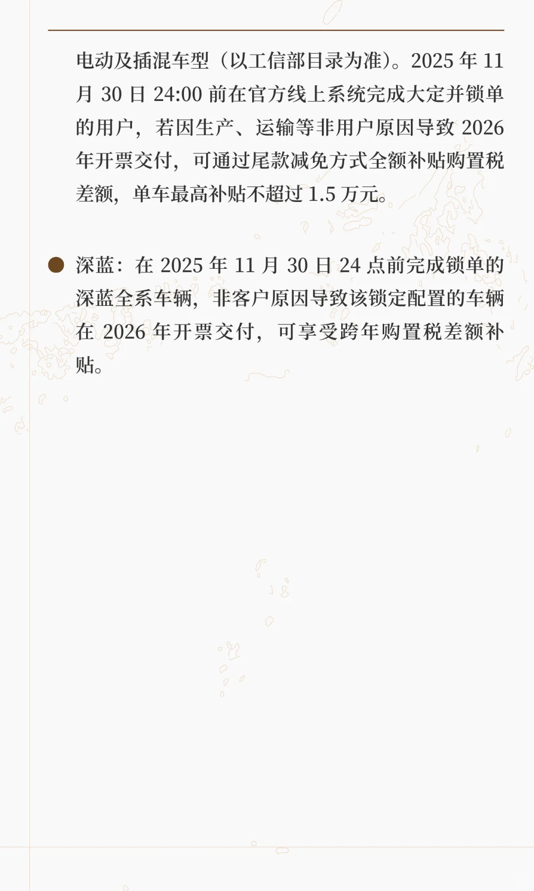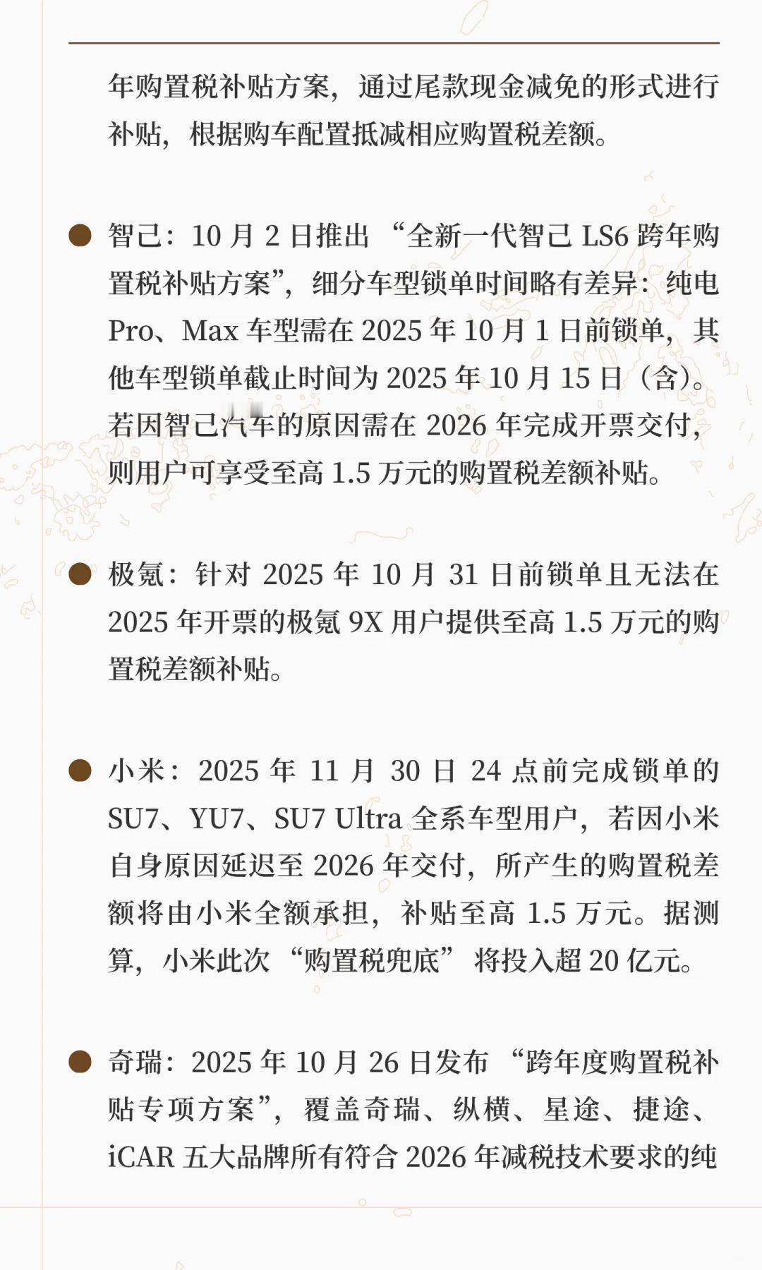这笔账得算明白打算入手新能源车的朋友注意了!2026 年起购置税从全免变减半,最高减免 1.5 万,买车成本要涨了。但别急,蔚来、理想、小米、奇瑞等品牌都出了跨年补贴方案。比如 30 万的车,2026 年本要多交 1.5 万税,现在锁单后车企直接补差额,最高补 1.5 万,确保你没额外支出。不同品牌锁单截止期不同,得抓紧盯紧。刚需党早买早享受,观望党可得盯紧时间。你会赶在优惠截止前下手吗?