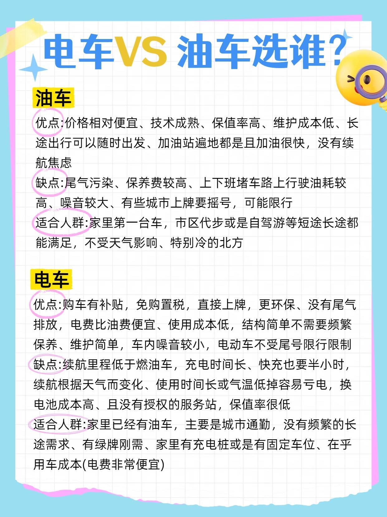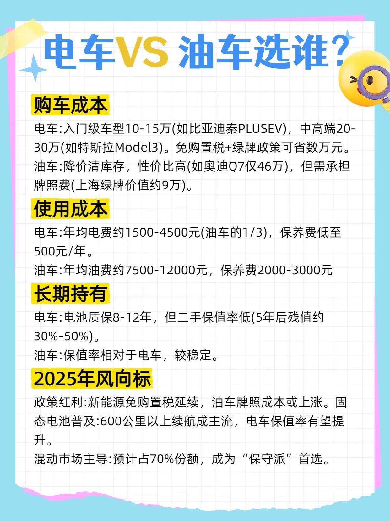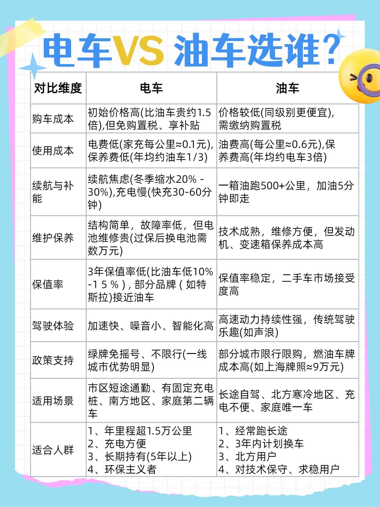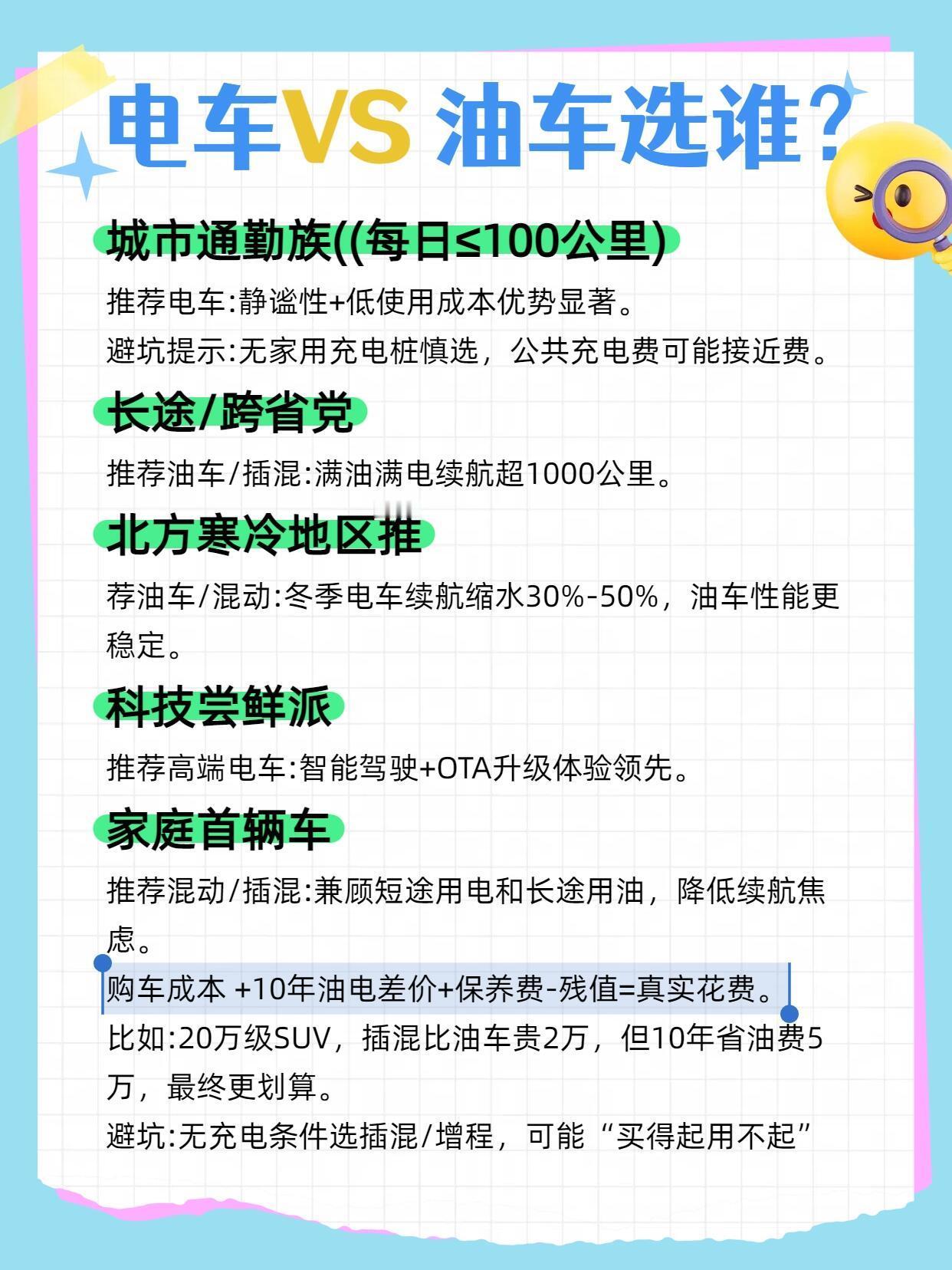 2025年了,油车和电车到底怎么选?油车:加满油5分钟,续航600km+,全国加油站覆盖,零下20℃照常启动,机械操控感拉满,适合长途党、老司机,以及「不确定未来3年换不换车」的人——保值率高,技术成熟,用着省心。电车:百公里电费5-8元(油车的1/5),家充桩谷电一晚充满,加速快、噪音小,智能座舱和辅助驾驶更聪明,适合通勤族、科技控,以及「家里能装私桩」或「充电方便」的用户——用得越久,成本优势越明显。纠结党可看下图,按需选,别跟风。