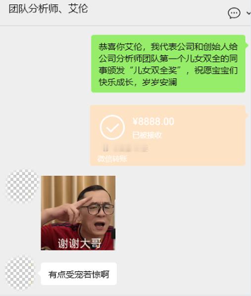 必须沾沾喜气艾伦加入团队四年多的时间了我们不仅仅是工作的同事,私下更是非常好的伙伴恭喜艾伦喜得龙凤胎,凑成一个“好”字,公司送上祝福,加油!