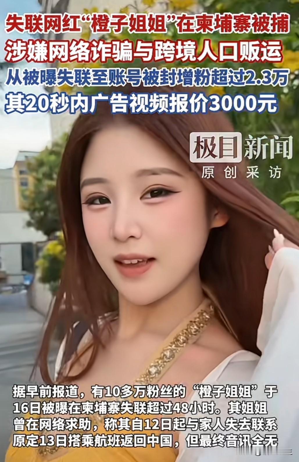 11月19日,柬埔寨警方证实,拥有百万粉丝的网红“橙子姐姐”张慕澄因涉嫌网络诈骗和跨境人口贩运被逮捕。这个以分享甜美日常走红的博主,11月初声称去西哈努克港探望男友,却在原计划回国日(11月13日)前突然失联。 惊人反转:家属曾哭着发视频寻人,网友纷纷同情,谁知真相是她深度参与犯罪!目前她被关在金边白梳监狱,面临两国法律制裁。这再次敲响警钟:那些在东南亚炫富的网红,背后可能藏着你想不到的黑暗!