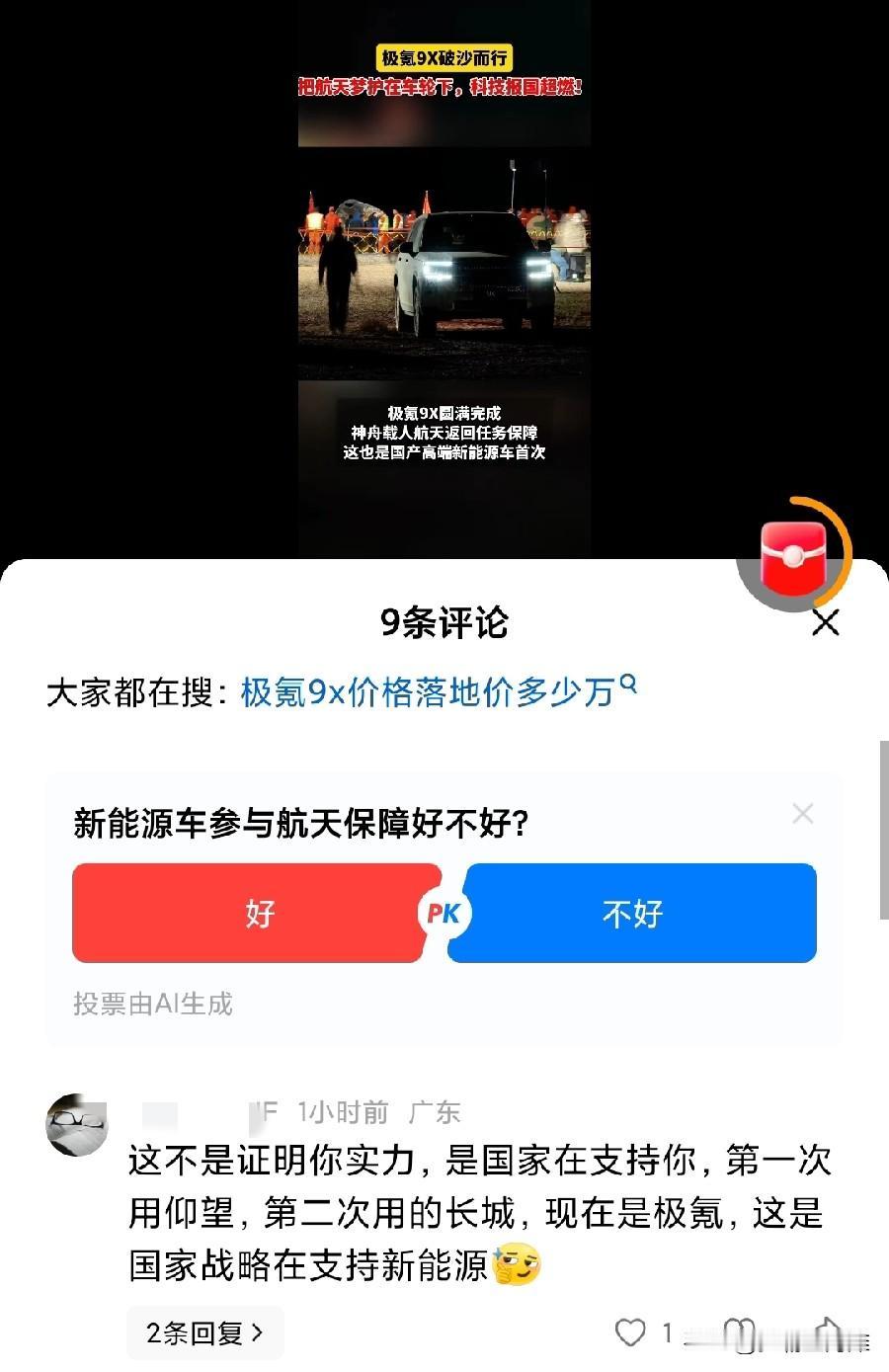 神舟20返回舱安全着陆,这一次成为保障护航的车居然是极氪九X。 目前成为护航车的有长城,有吉利,有比亚迪仰望U8。我觉得这个网友说的是对的,这不是证明某家车企的实力,是国家在支持新能源汽车产业的发展。神舟20号